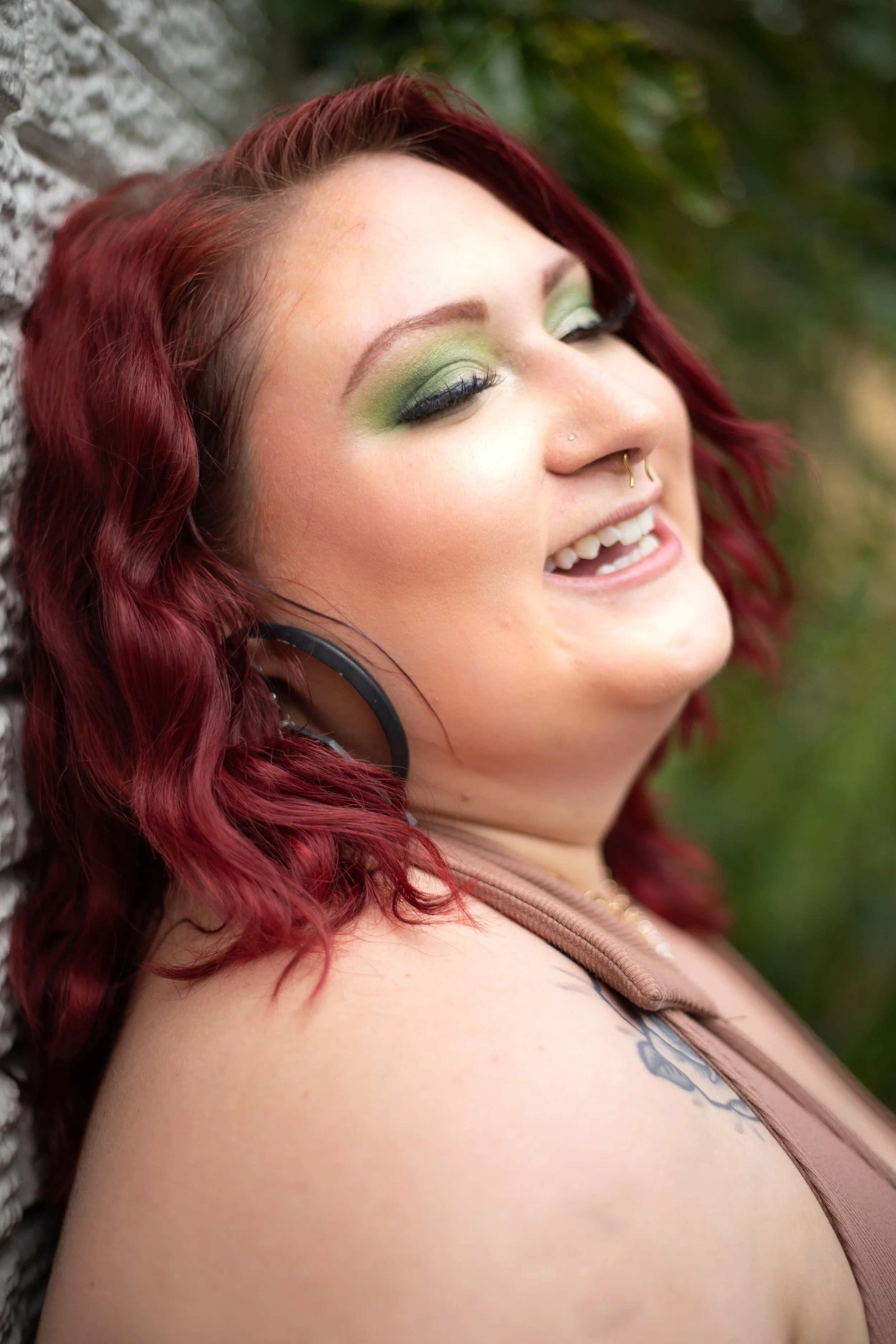 Person with red hair, green eyeshadow, and septum piercing, smiling outdoors next to a wall.