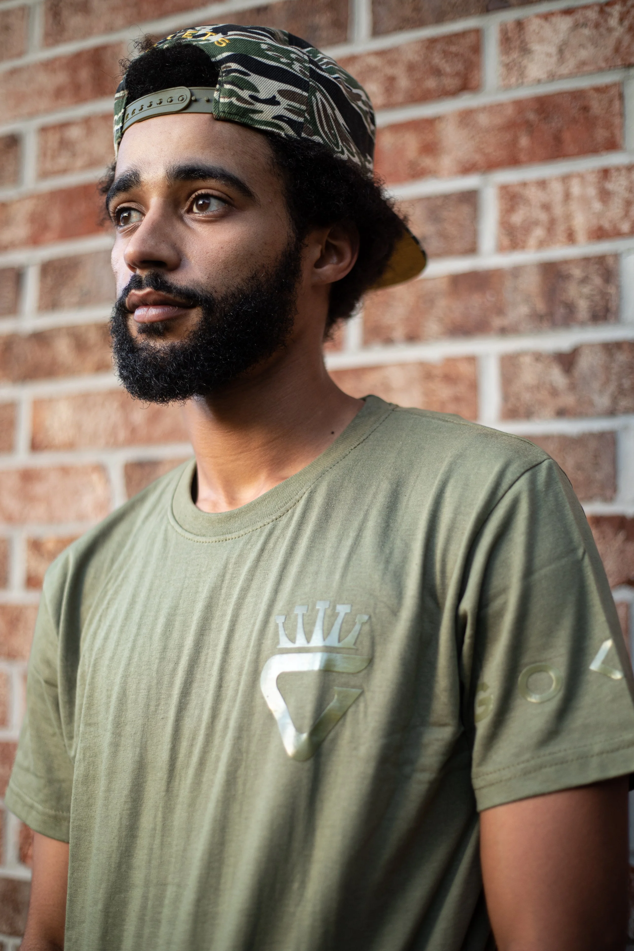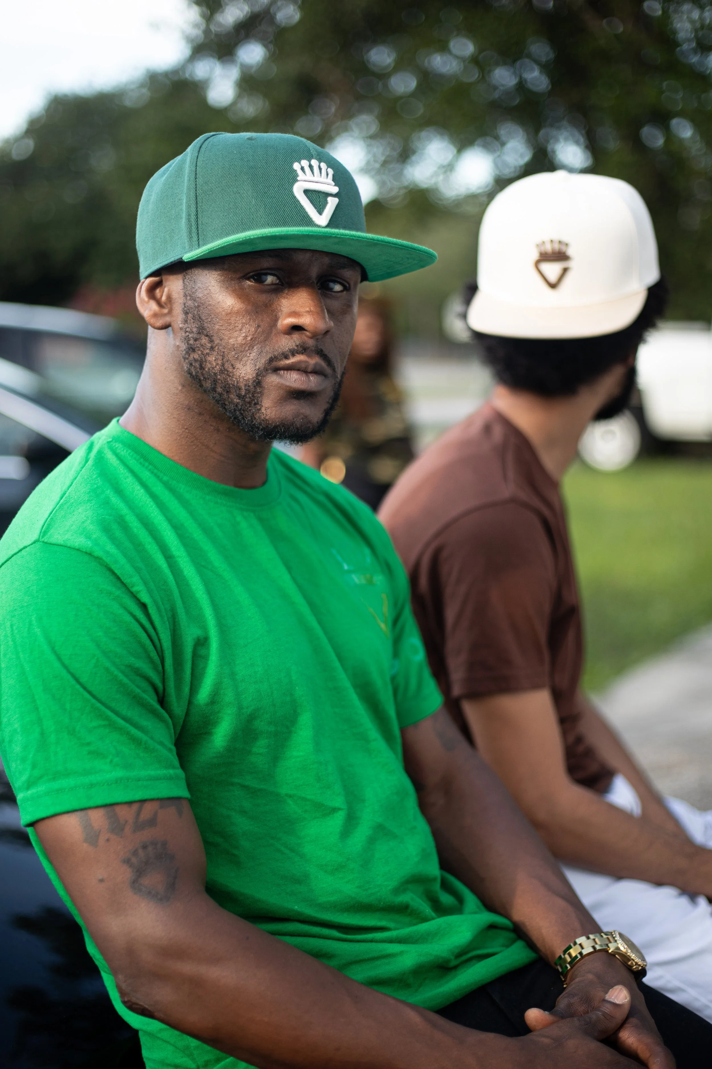 Man with a beard wearing a green shirt and a camo cap, standing against a brick wall.
