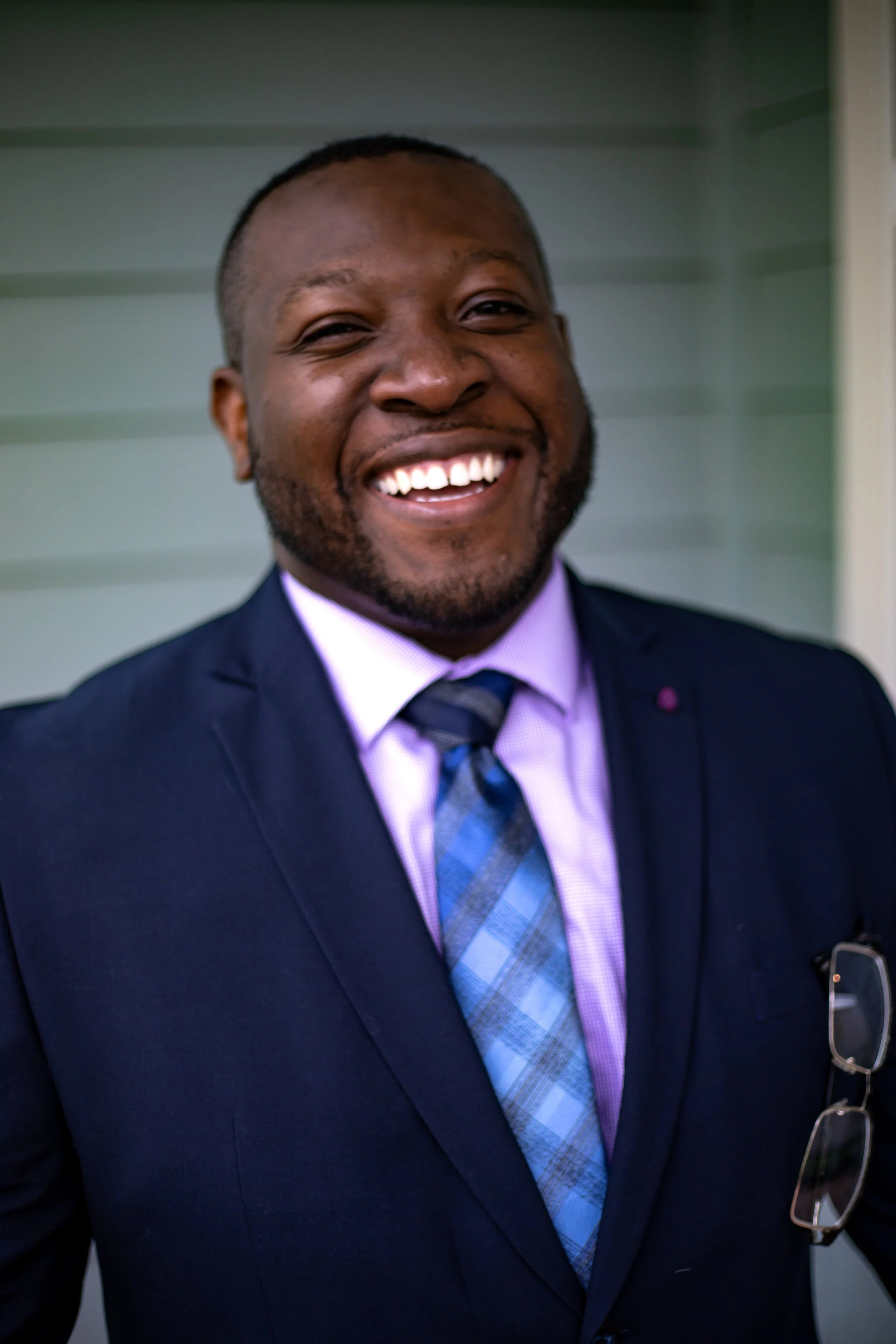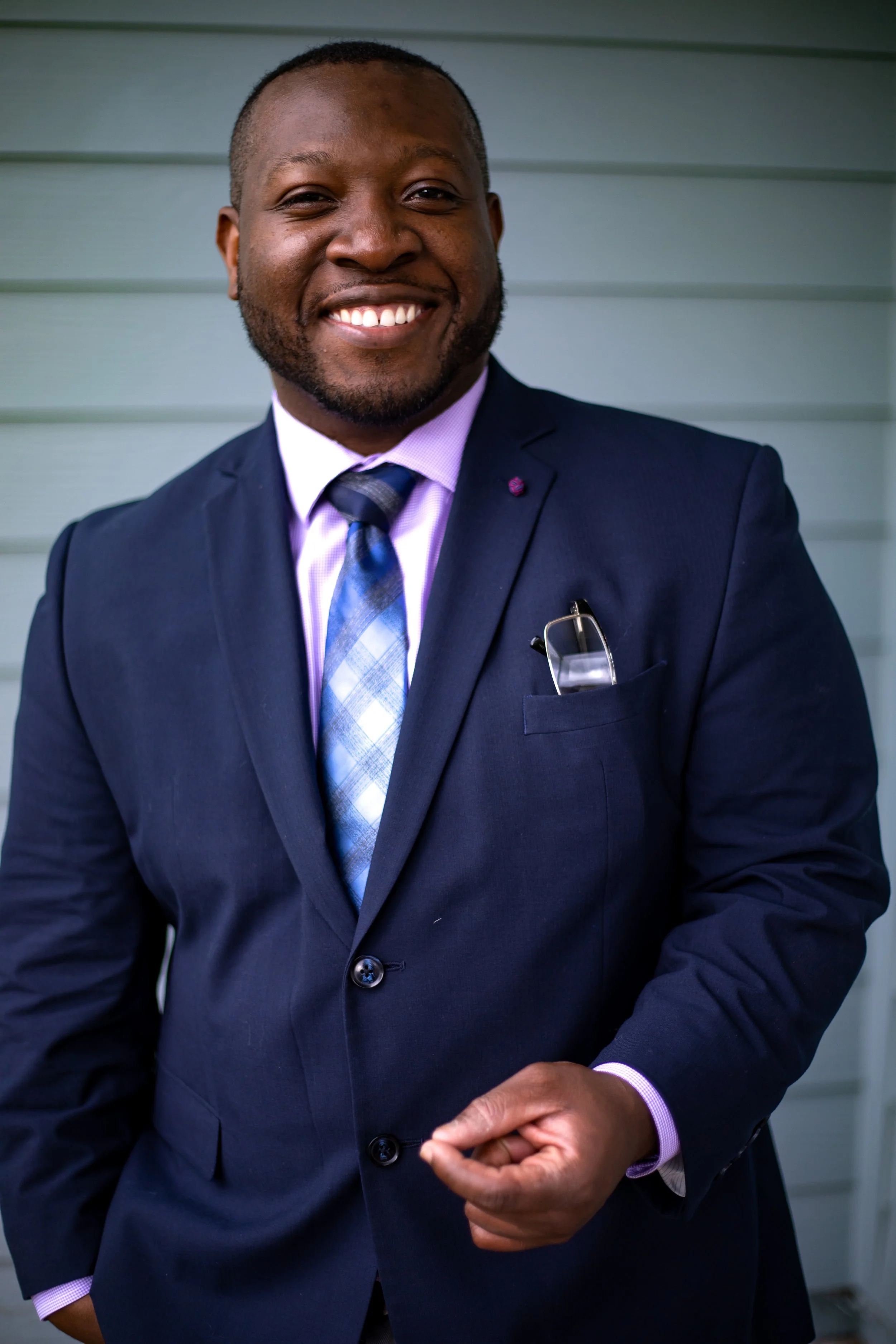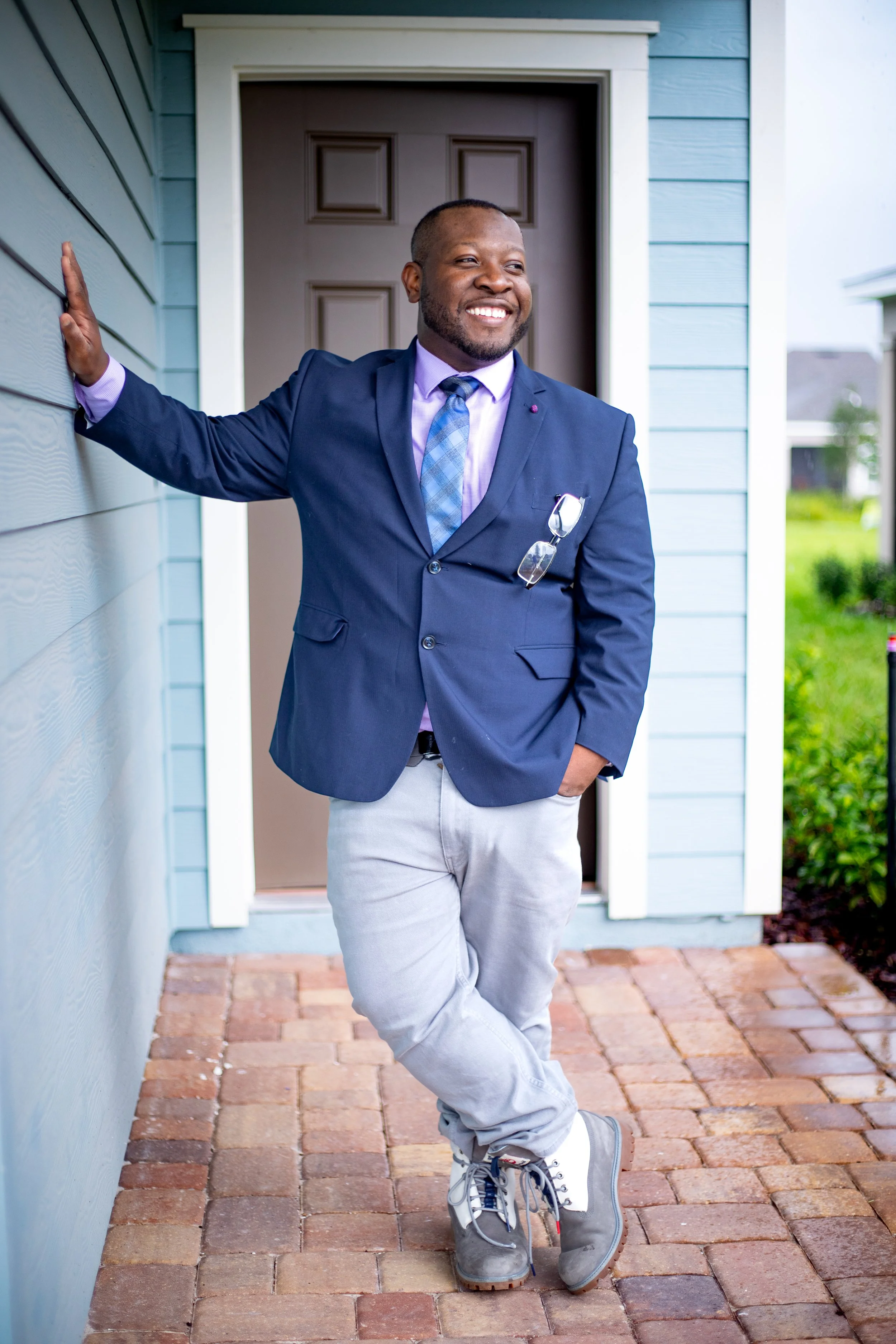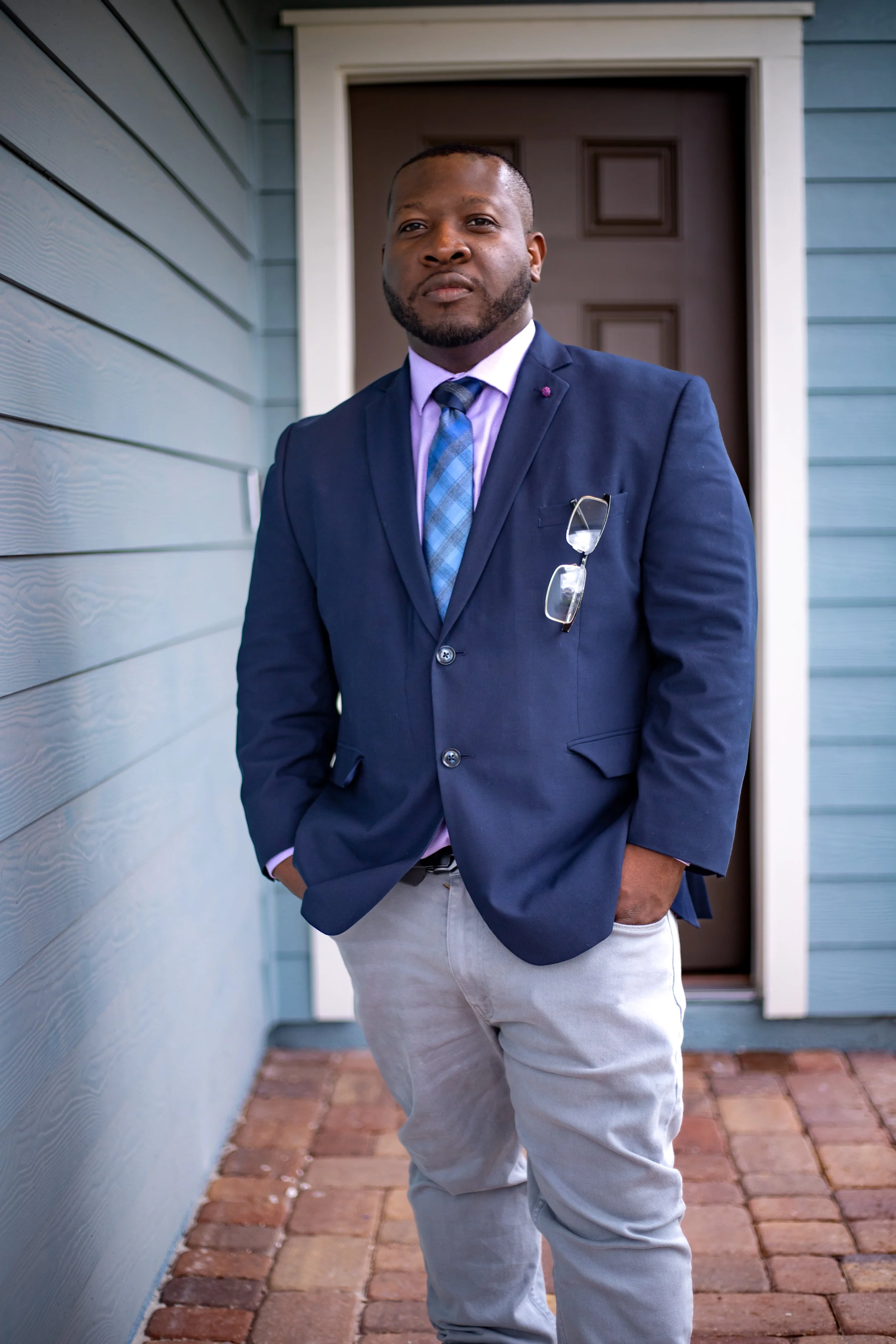 Man in blue suit with lavender shirt leaning against a wall, smiling in front of a doorway outside a house.
