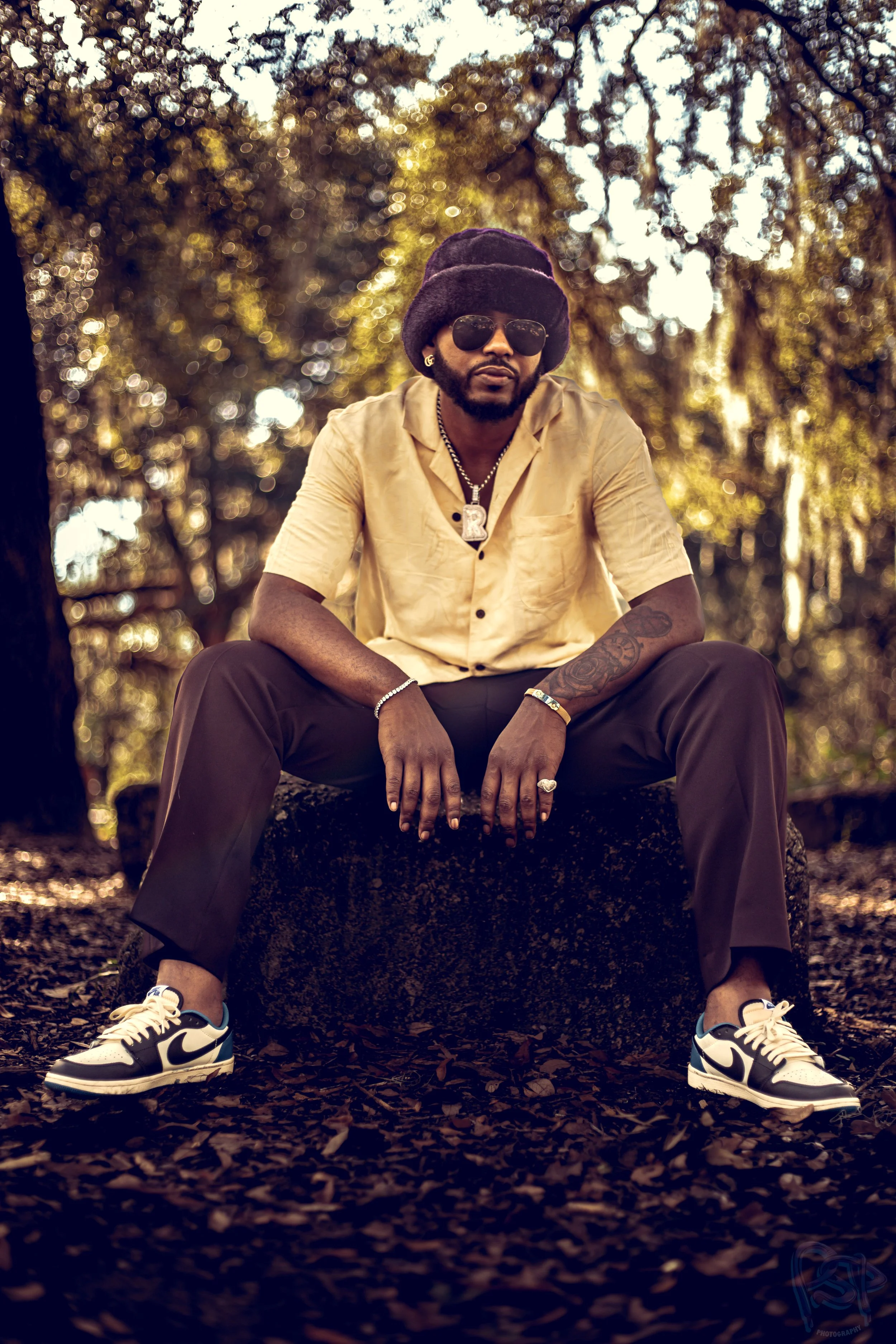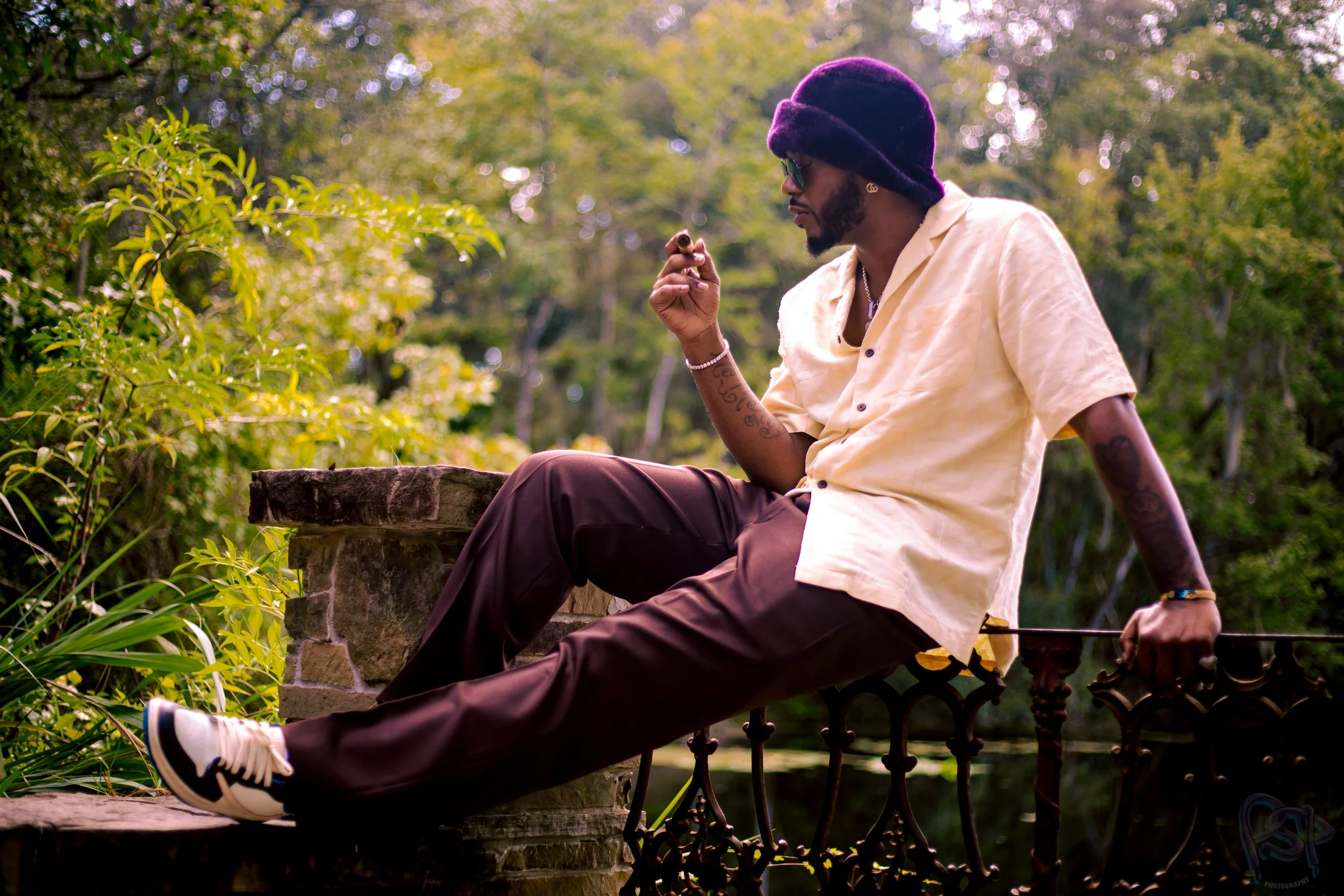 Man wearing a cream shirt and brown pants sitting outdoors, sporting a dark hat, sunglasses, and sneakers, surrounded by trees.
