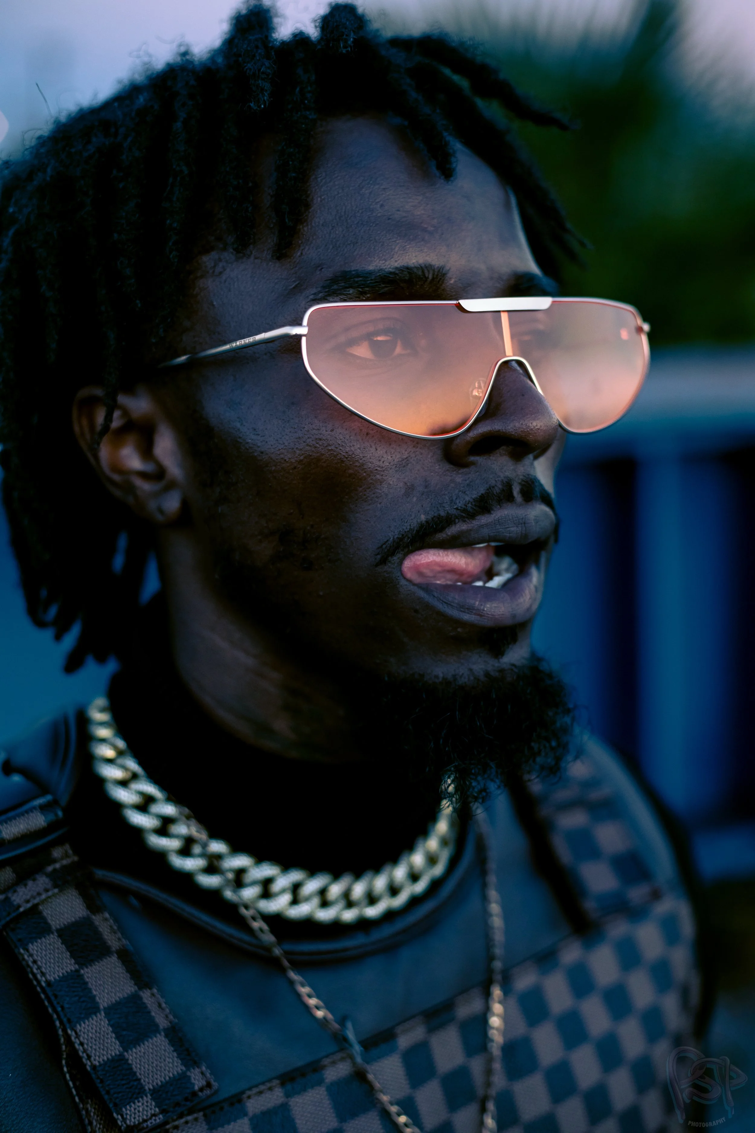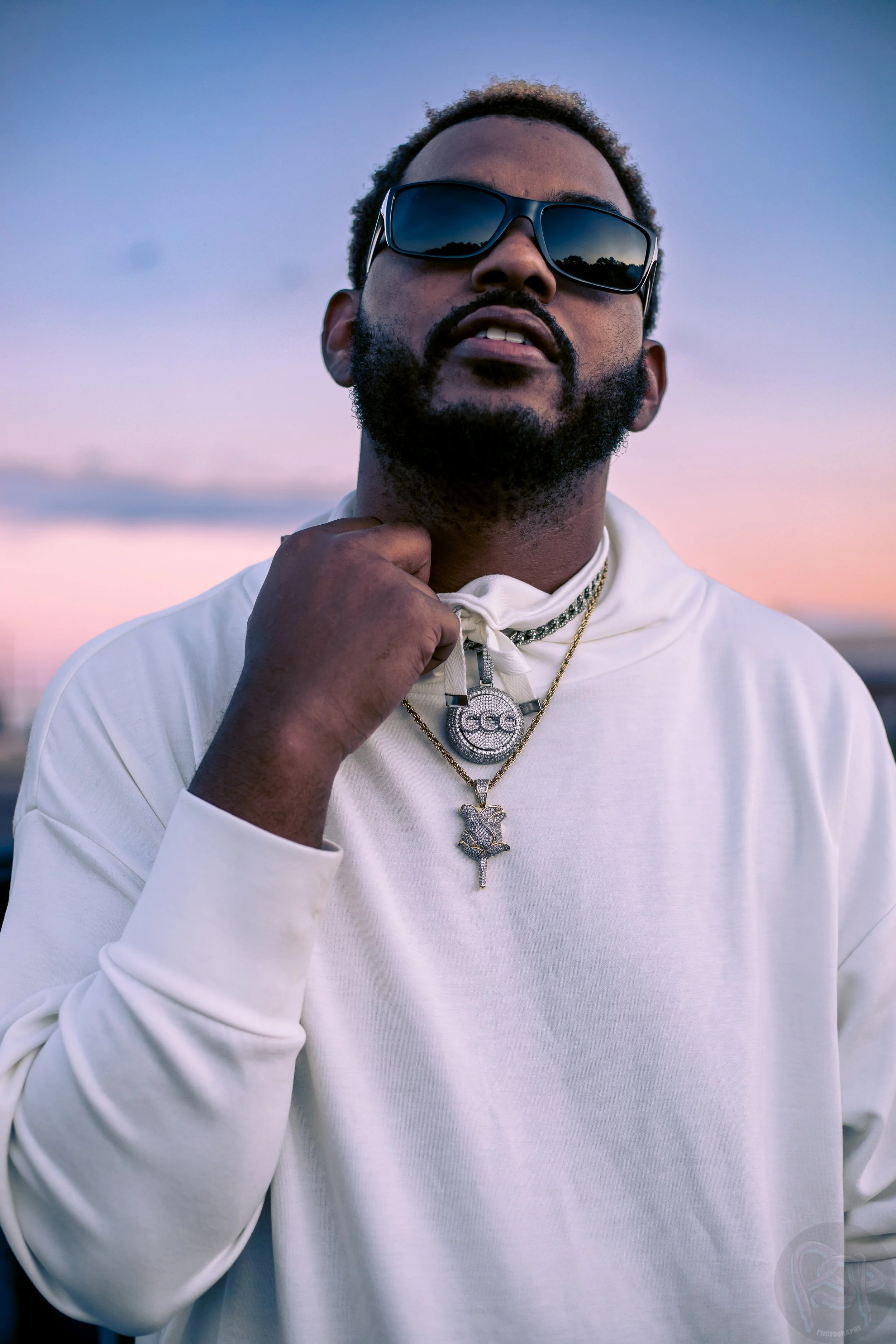 A man wearing sunglasses and a white hoodie stands under a sunset sky. He has a beard and is holding a chain with a pendant, accompanied by another necklace with a cross, both with intricate designs.