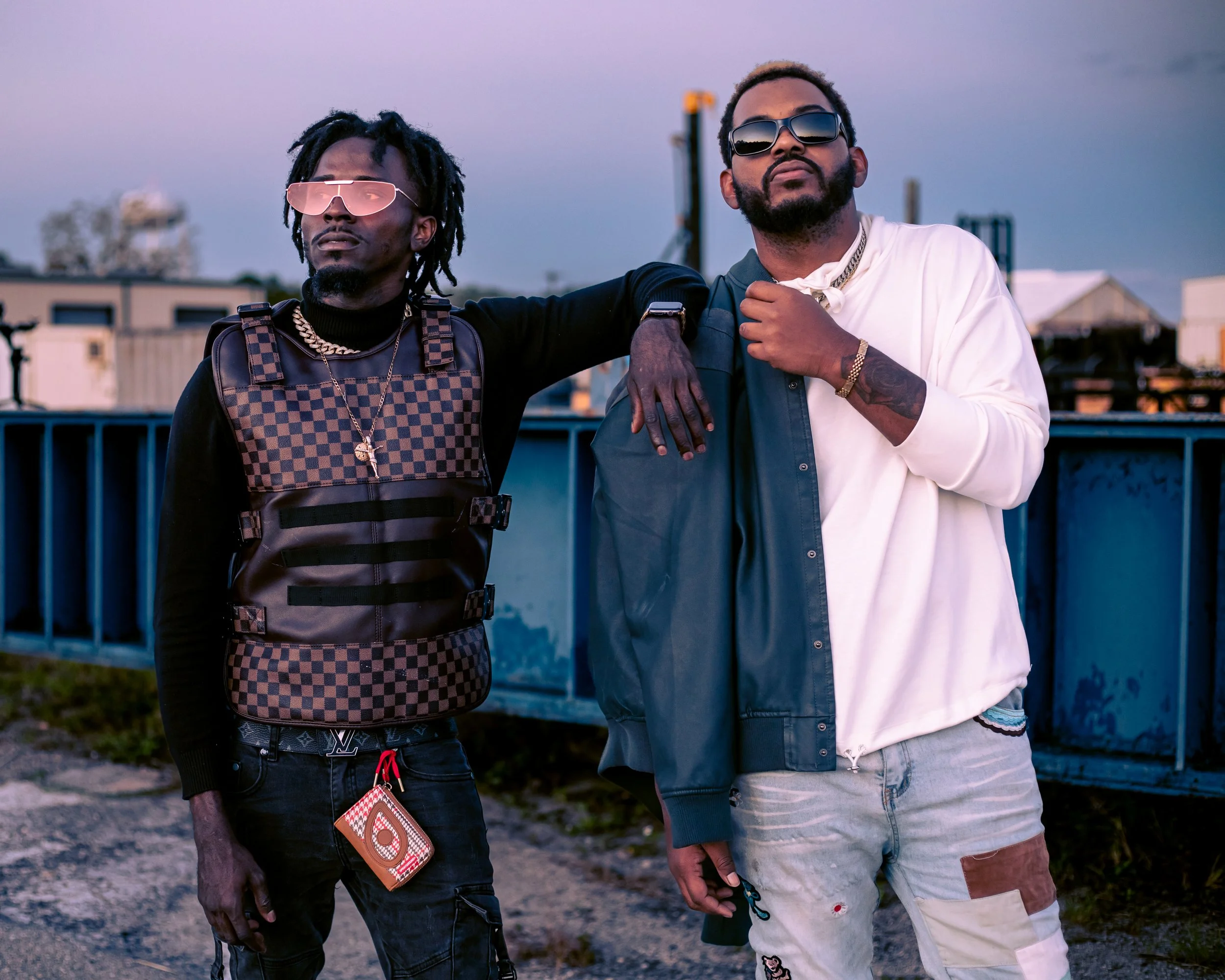 Two men posing outdoors, one wearing a checkered vest and sunglasses, the other in a white long-sleeve shirt with ripped jeans and sunglasses. They are standing near a blue metal structure.
