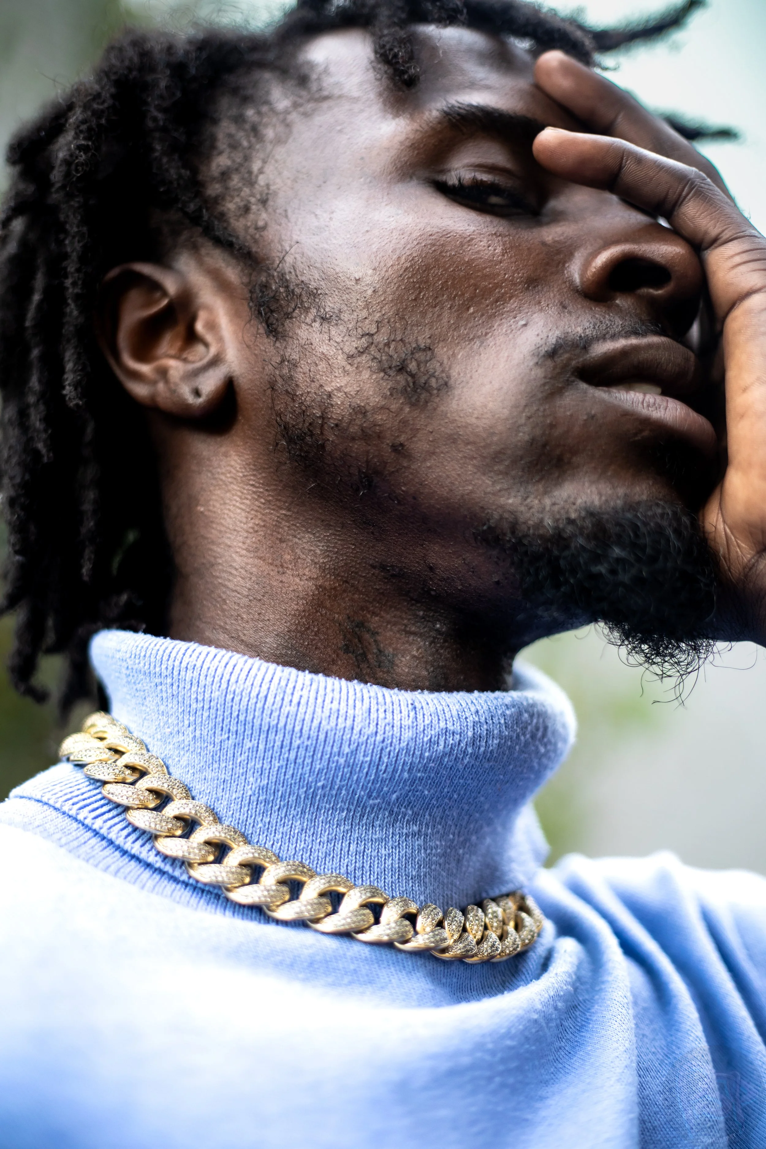 Close-up of a person wearing a blue turtleneck and gold chain, partially covering their face with a hand.