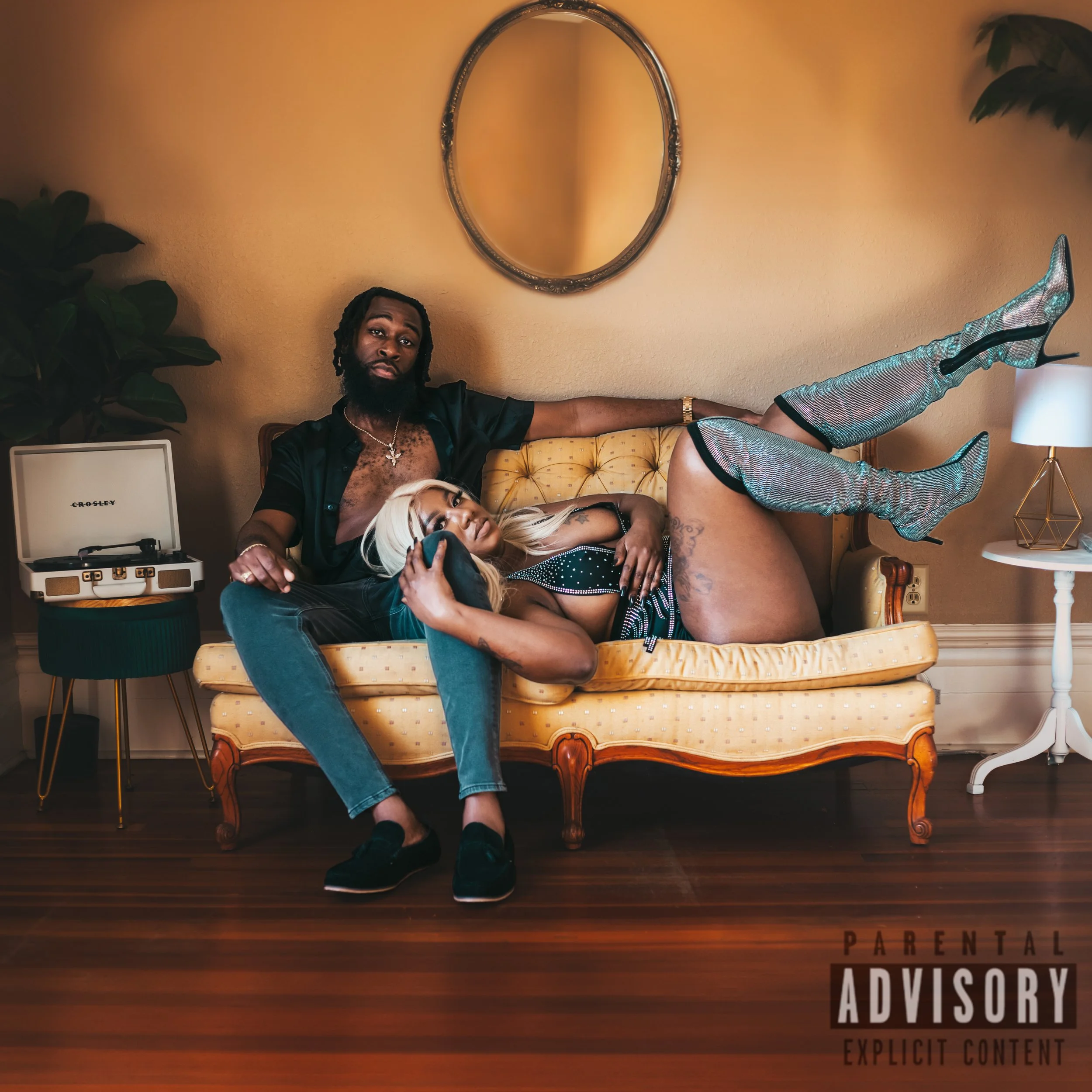 Album cover featuring a man sitting and a woman standing behind him, with a graphic background and a parental advisory label.