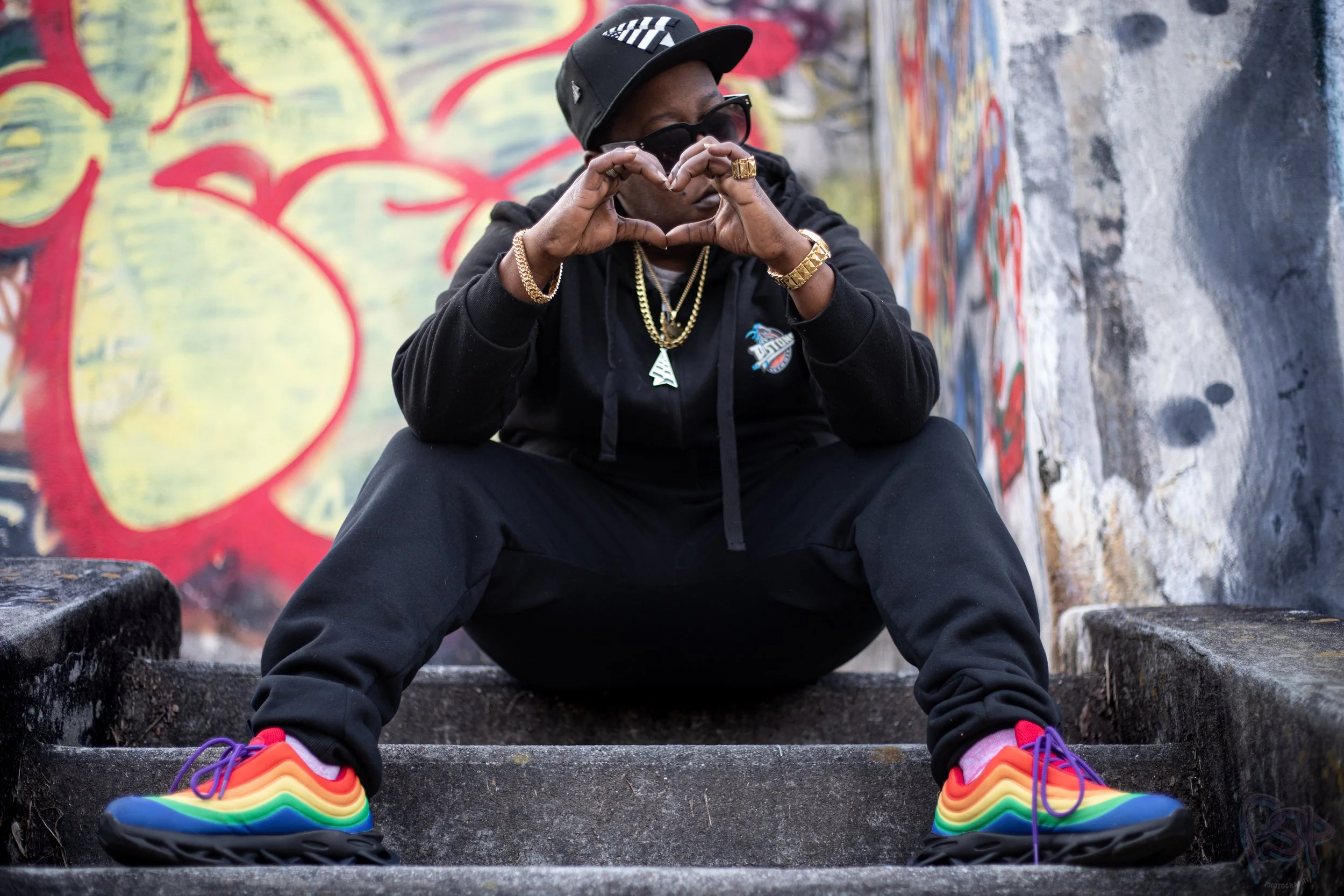 Person sitting on steps making a heart shape with hands, wearing vibrant rainbow-colored shoes, a black outfit, and gold jewelry, in front of colorful graffiti.