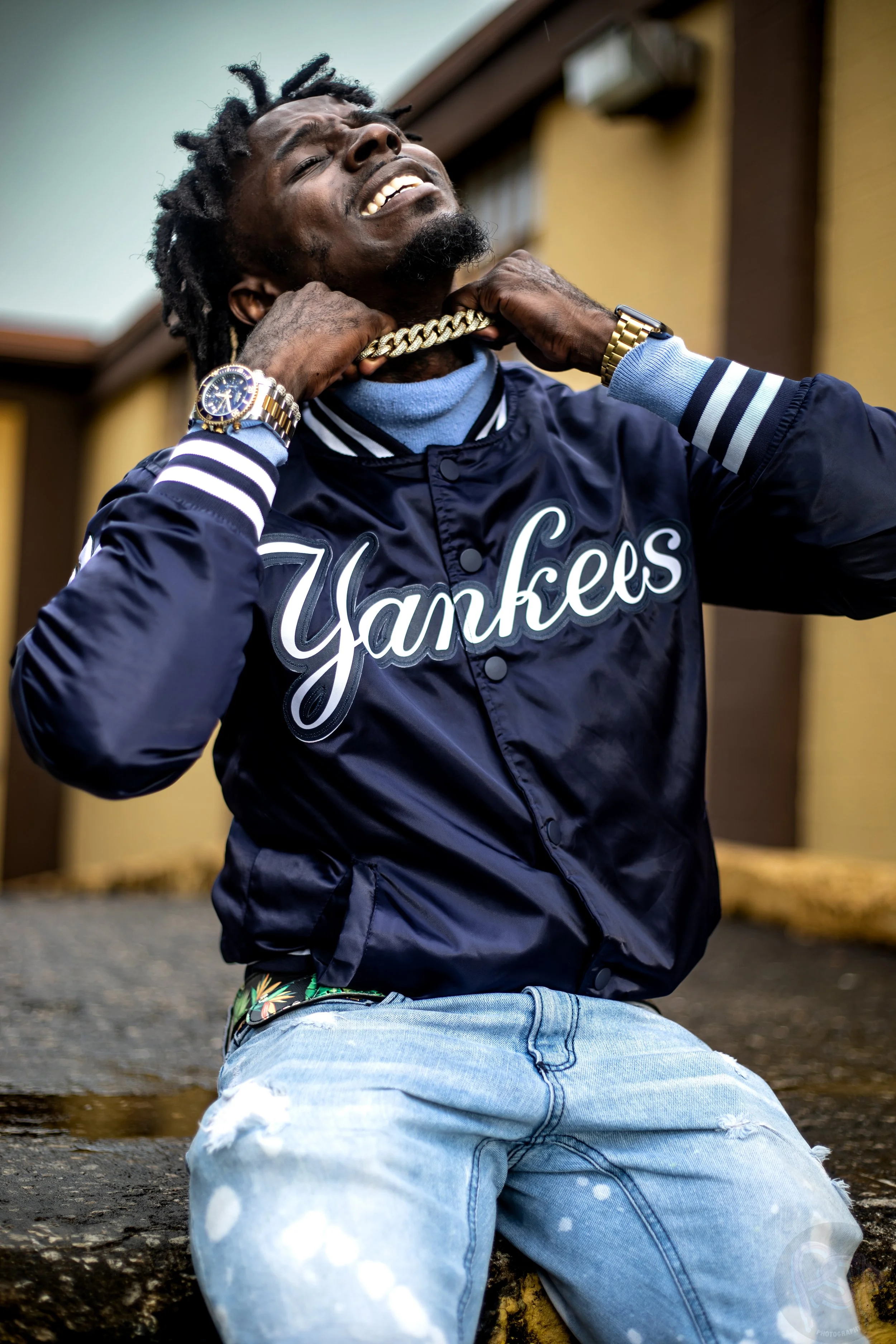 Person wearing a Yankees jacket, light blue jeans, and gold watches, holding a gold chain necklace.