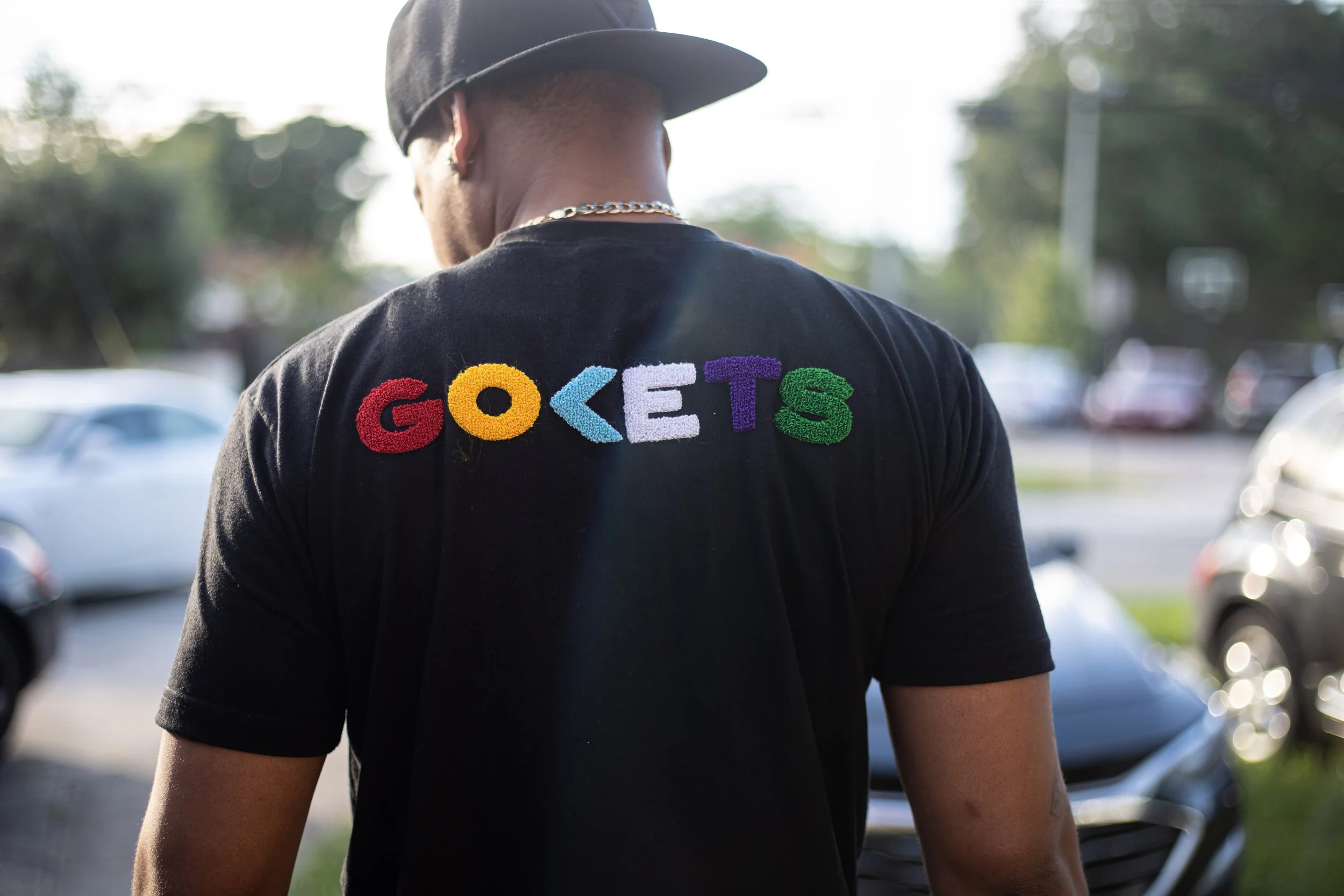 Person wearing a black T-shirt with colorful letters spelling "GOCKETS" outdoors in a street setting.