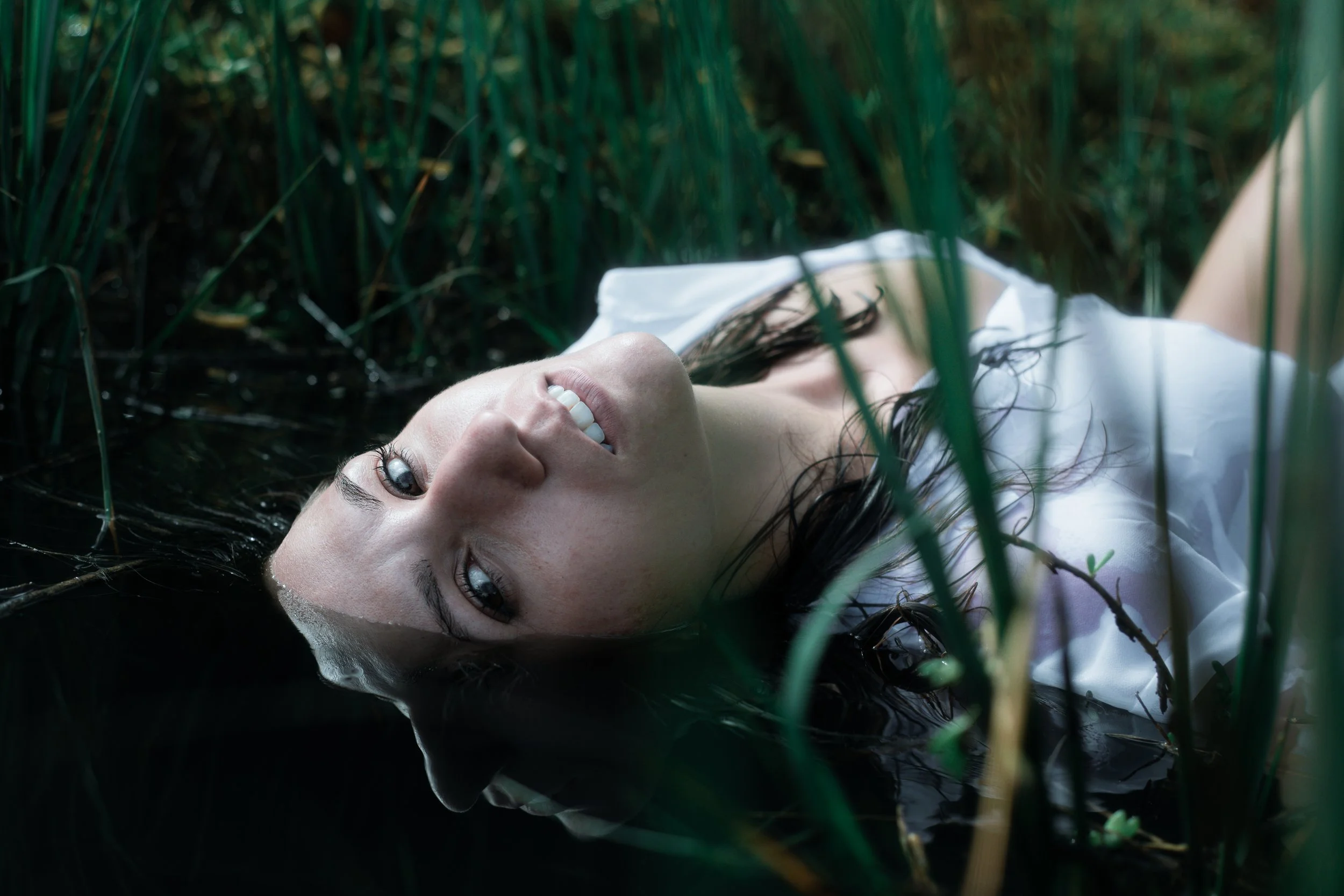 Woman lying in water surrounded by reeds, wearing a white shirt, with her face partially submerged and reflected.