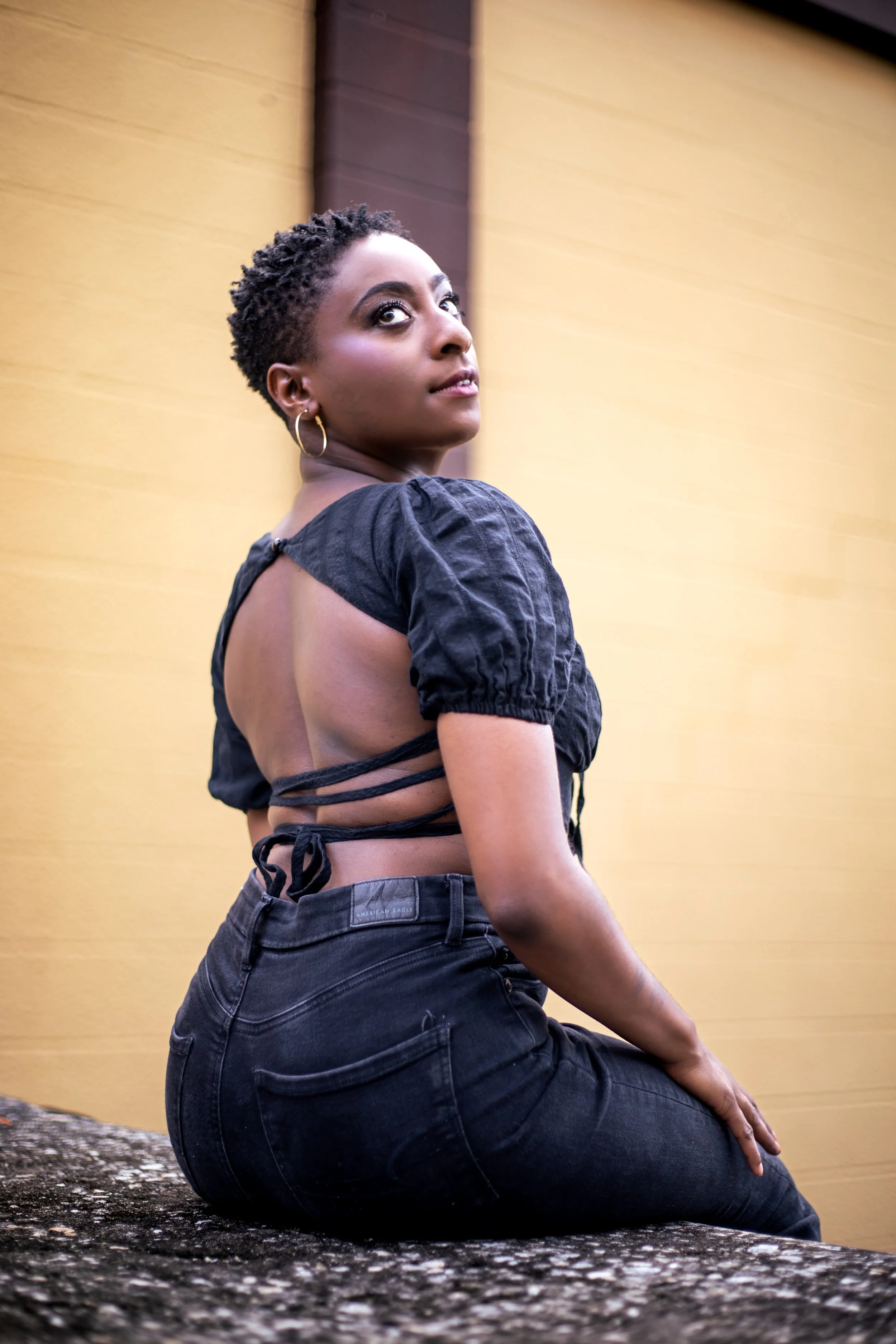 A person sitting sideways on a textured surface, wearing a black open-back top with tie details and black jeans, against a yellow wall background.