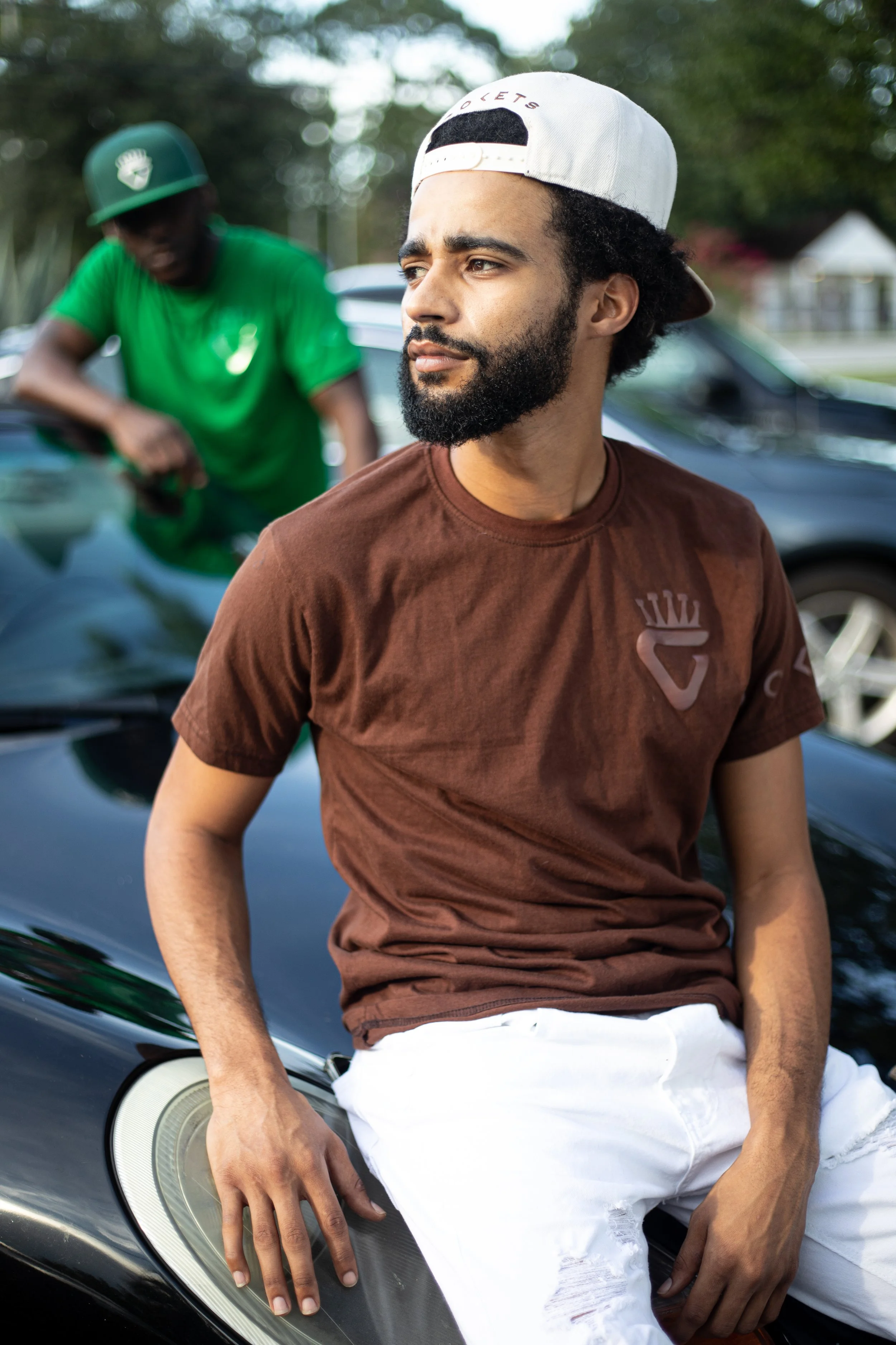 Two men outdoors, one sitting on a car with a brown t-shirt and backward white cap, the other leaning on the car wearing a green t-shirt and cap.