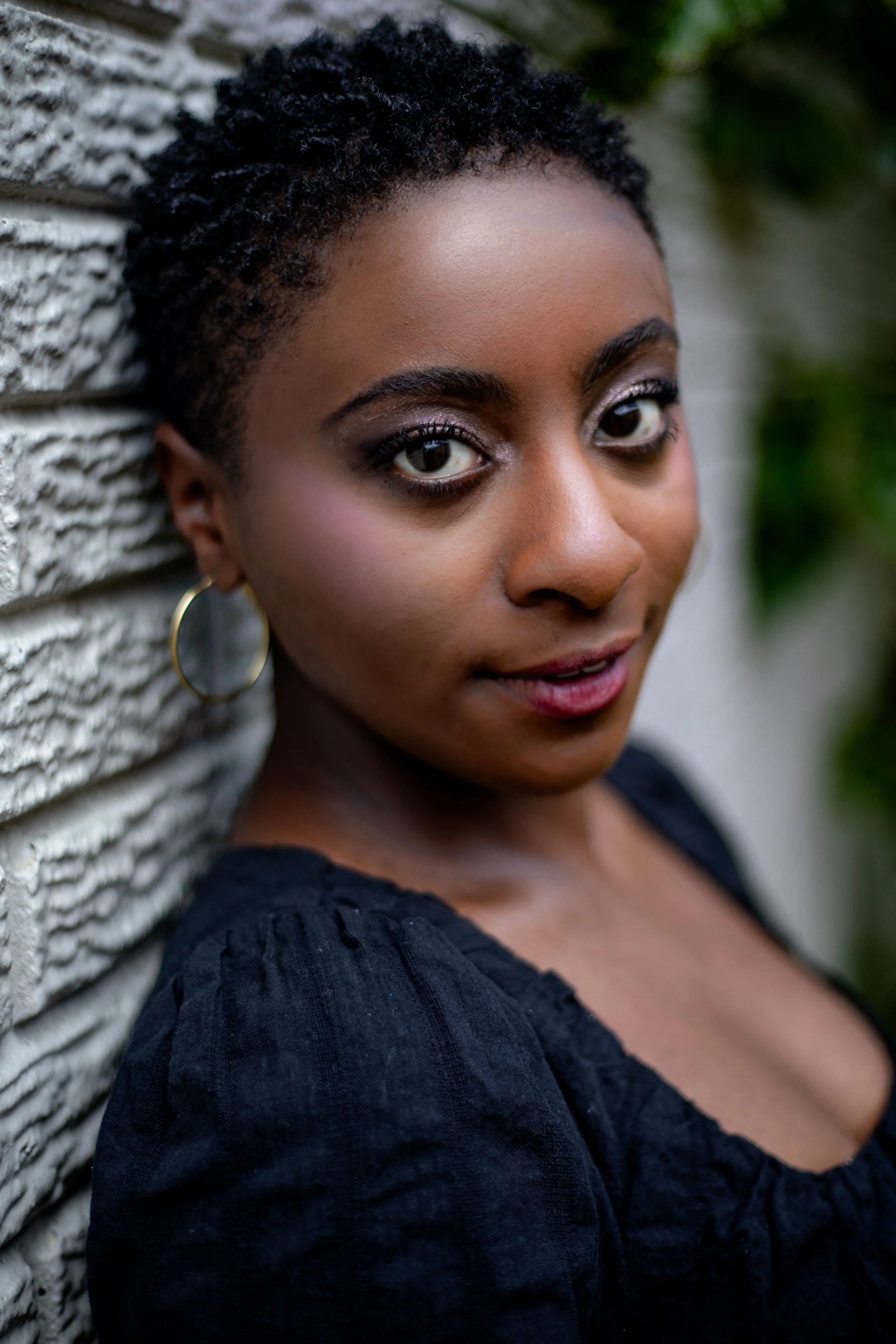 Close-up portrait of a person with short curly hair, wearing a black top and hoop earrings, leaning against a textured brick wall, with greenery in the background.