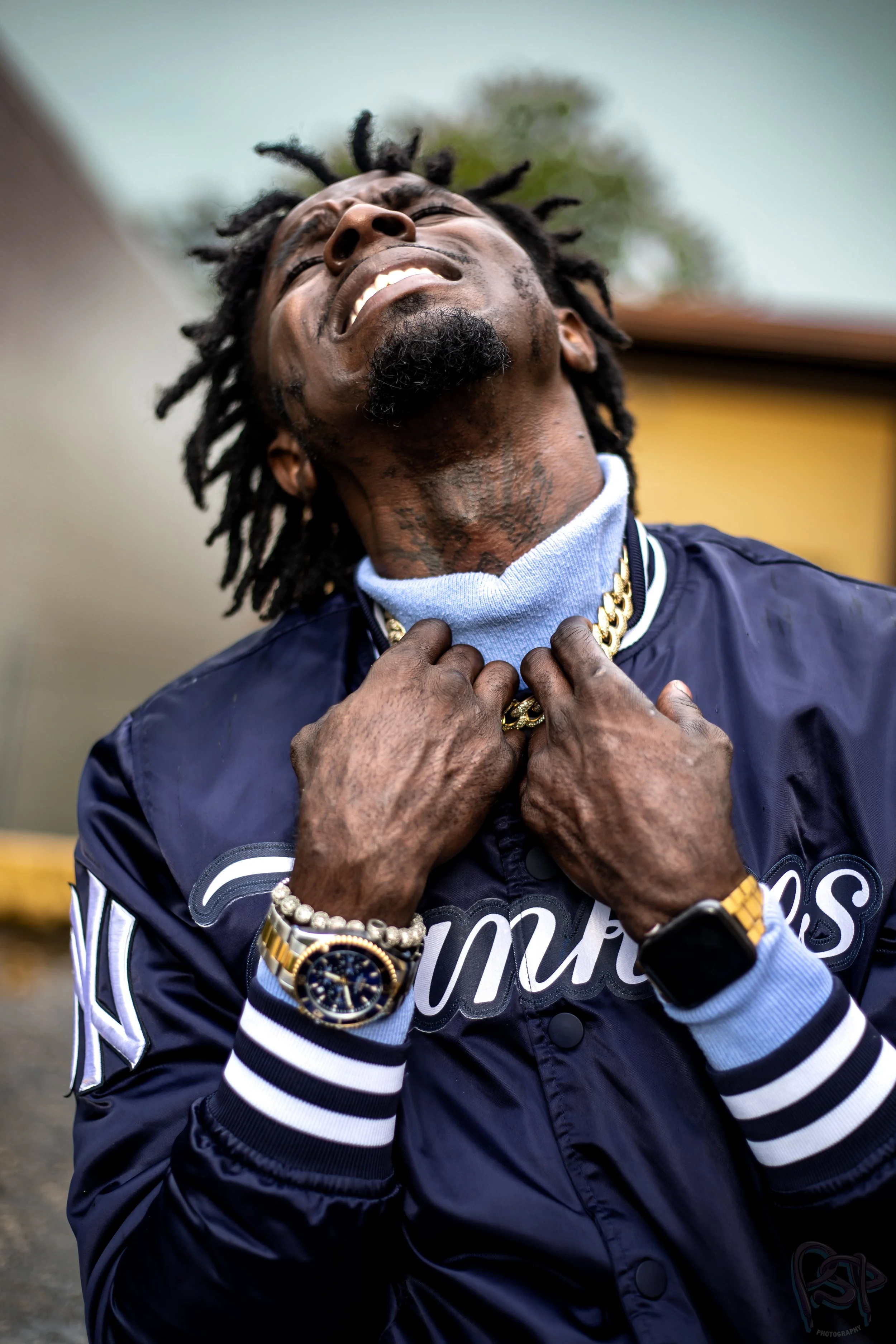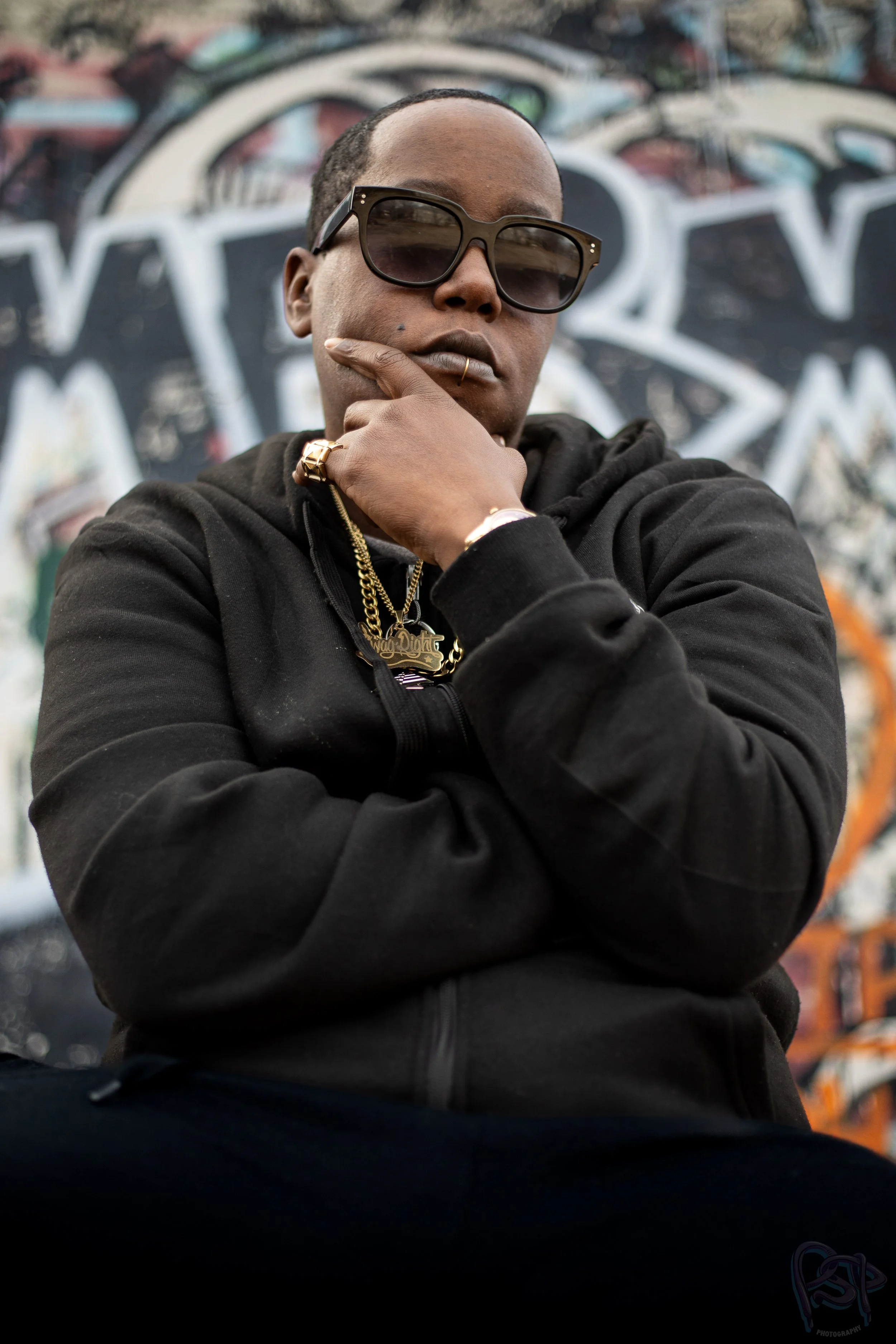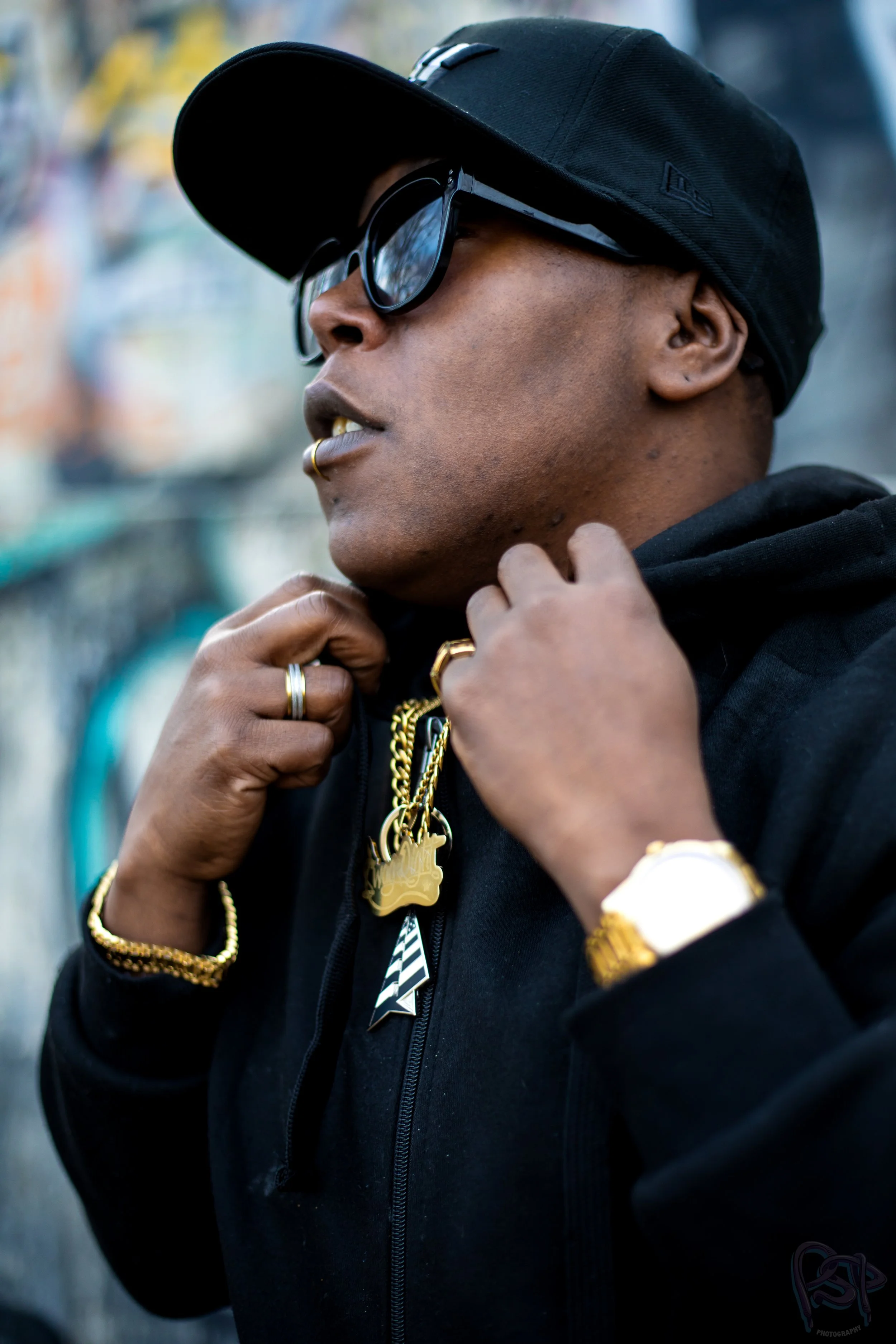 Man wearing black baseball cap and sunglasses, adjusting hoodie, with gold jewelry and rings, against graffiti wall background.