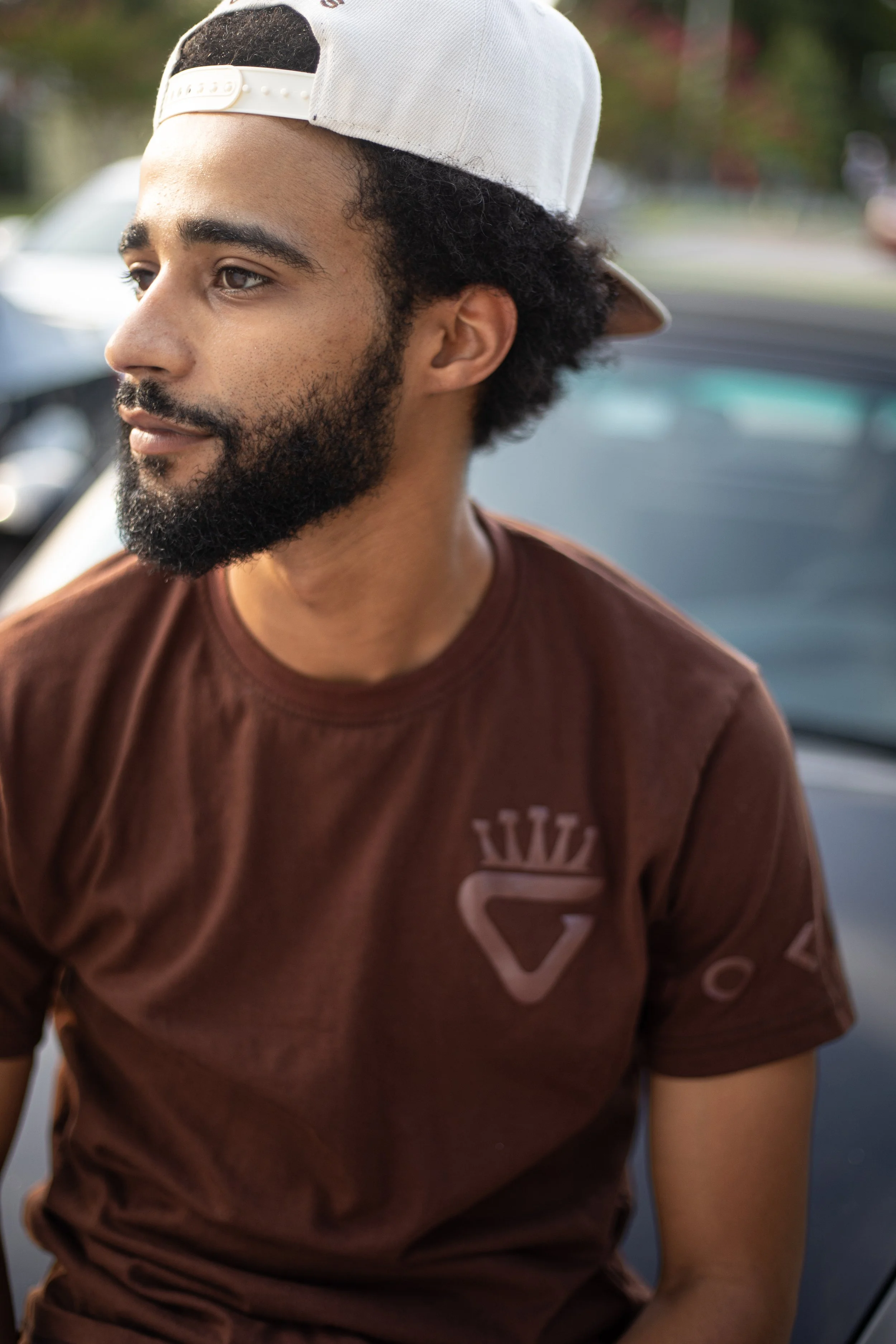 Man with a beard wearing a brown t-shirt and a backward white cap, seated outdoors.