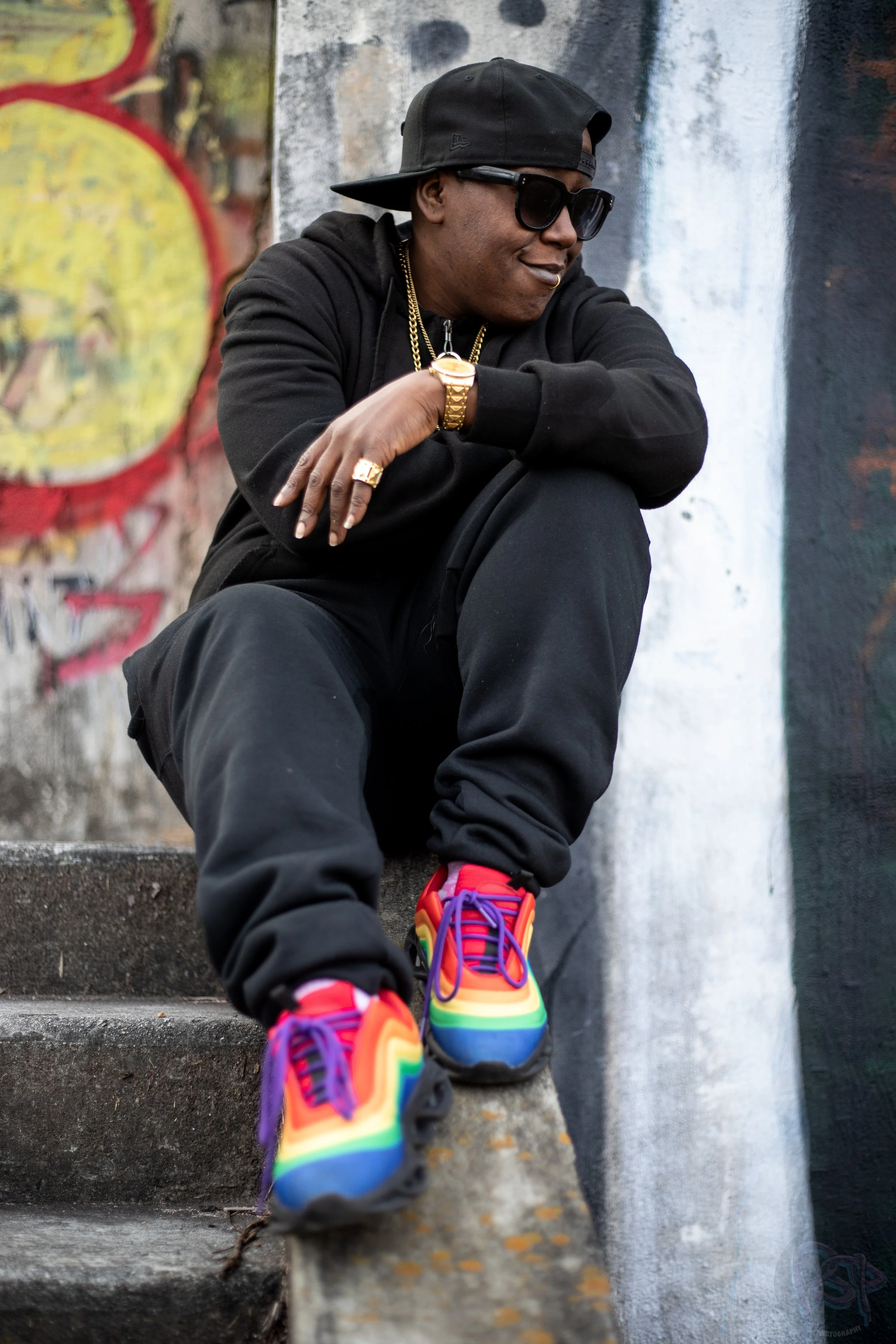 Person sitting on steps wearing a black hoodie, rainbow sneakers, and gold accessories, with graffiti in the background.