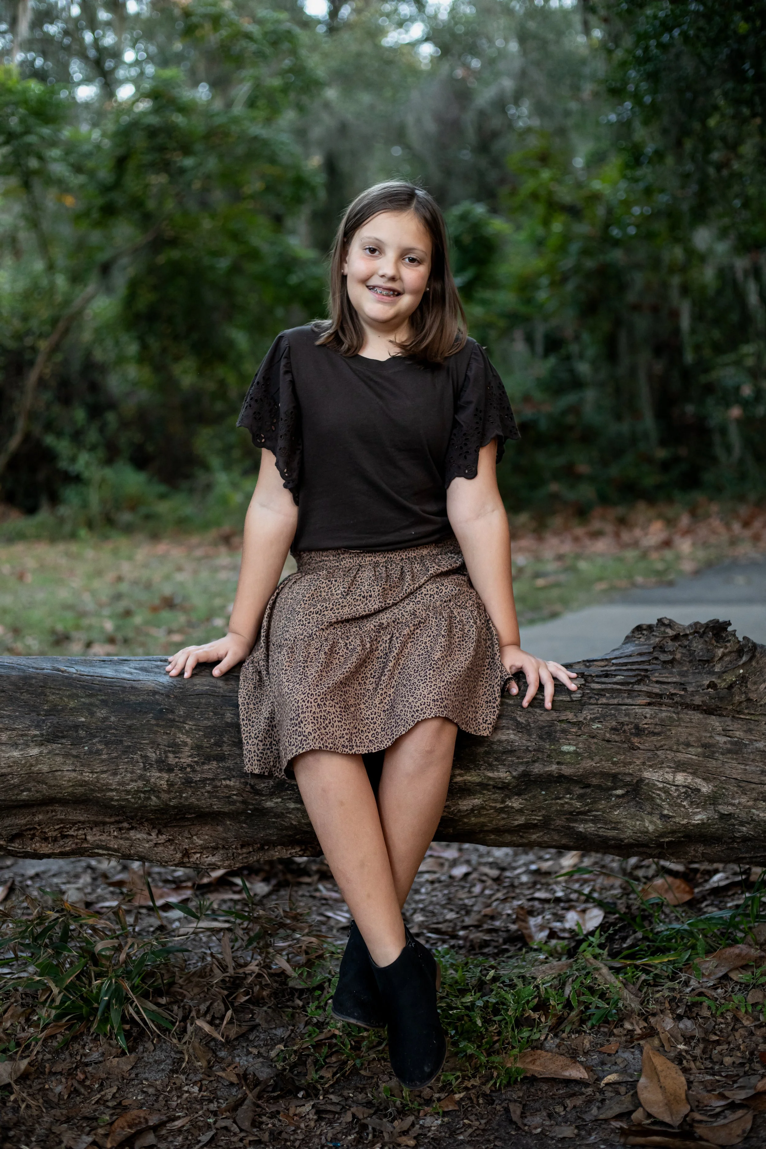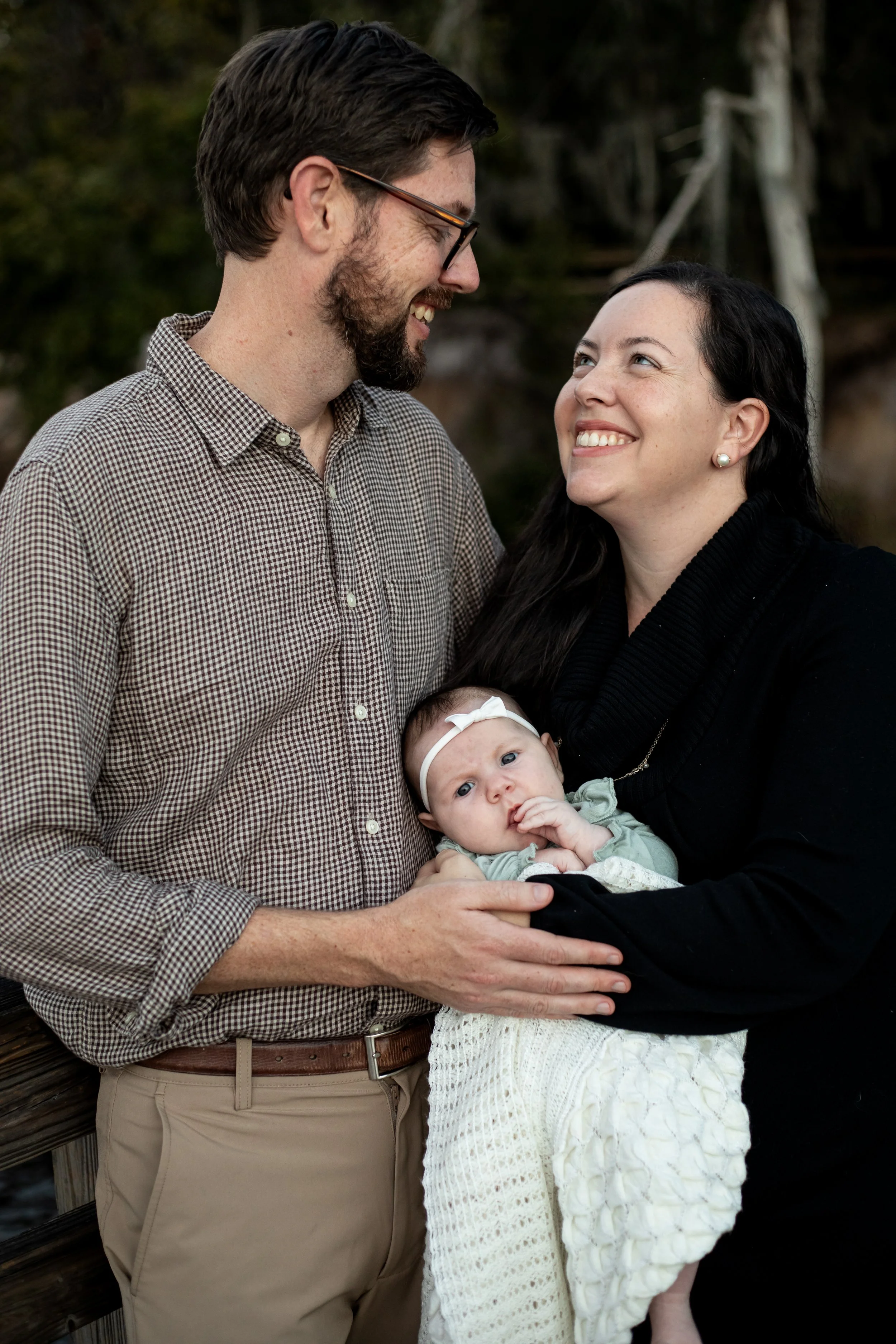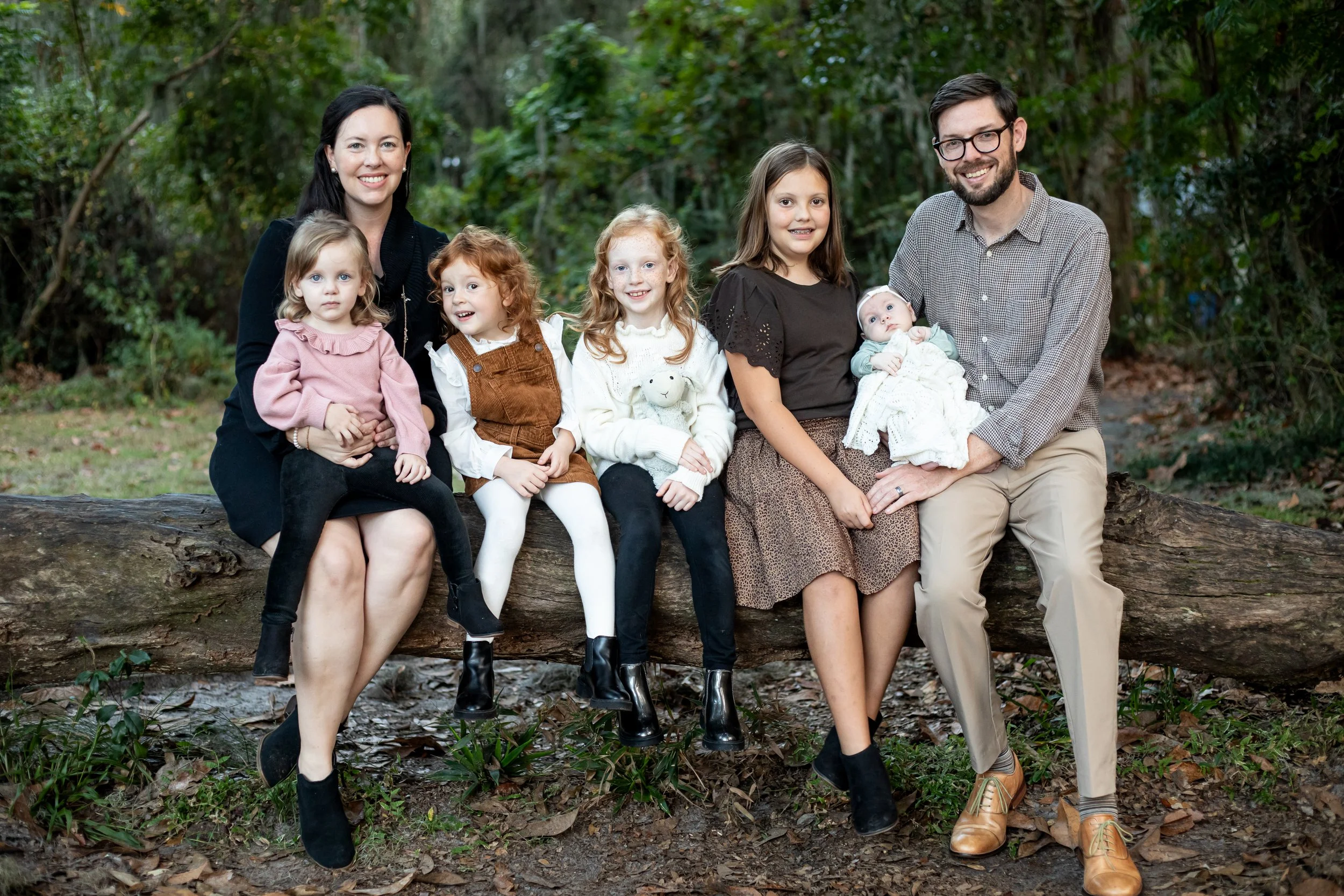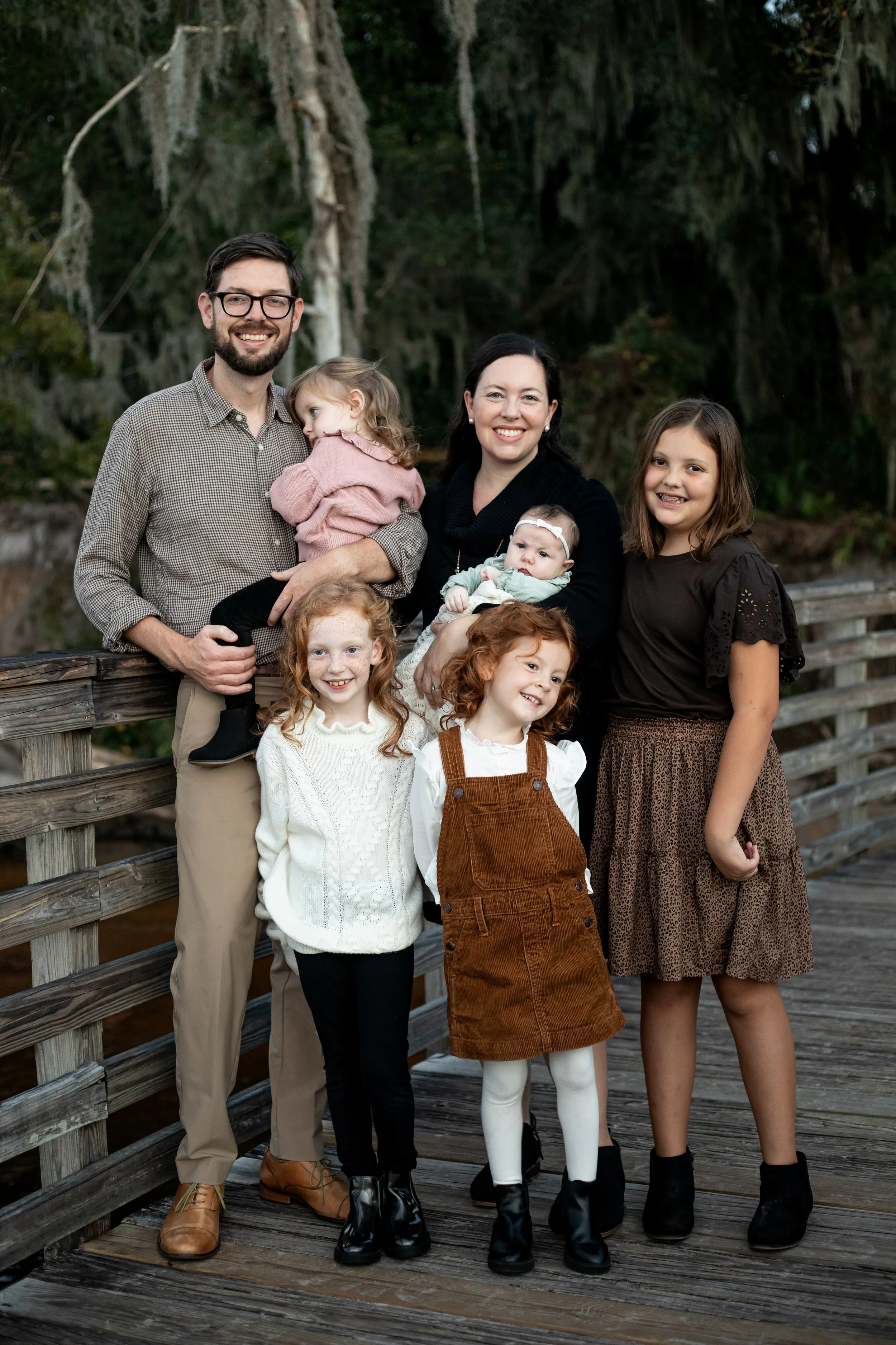 Surrounded by towering trees and the hush of a misty afternoon, a loving family gathers beneath soft, overcast skies, their laughter bringing warmth to the cool woodland air.
