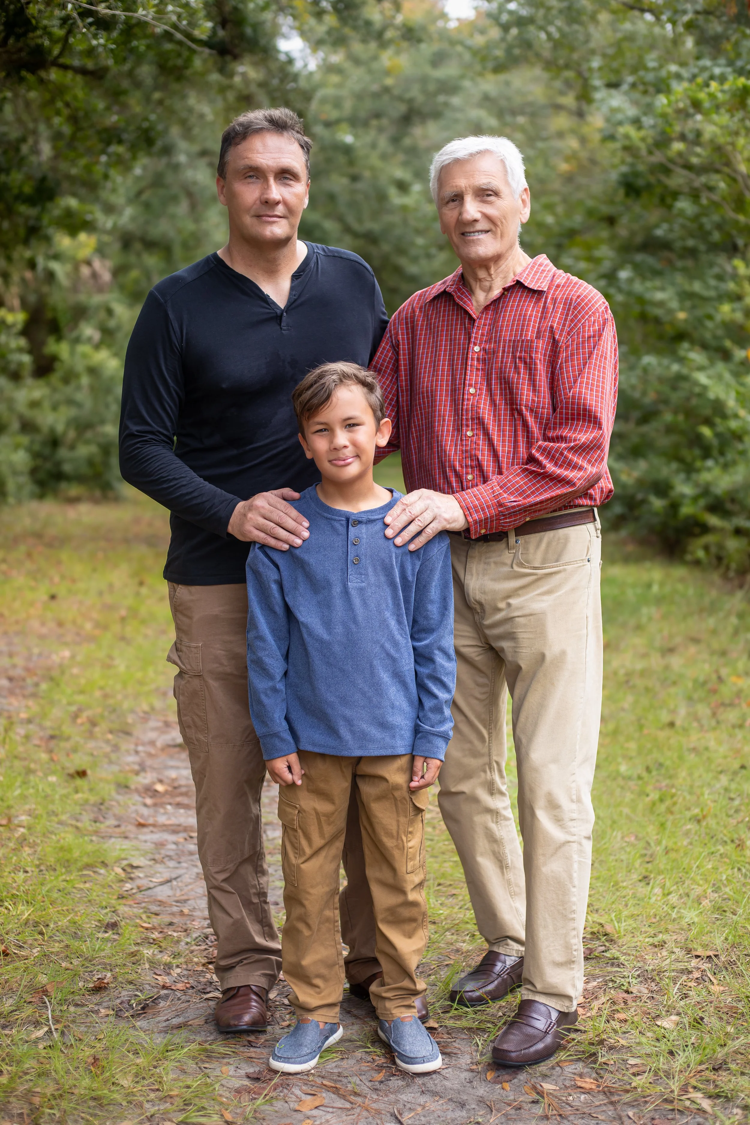 Bathed in warm sunlight, a large family, from cherished grandparents to grandchildren, gathers along a wooded path, their laughter and love weaving through the trees