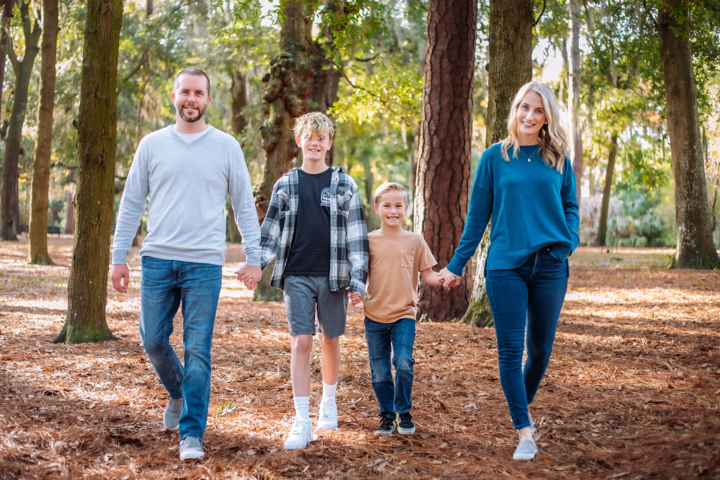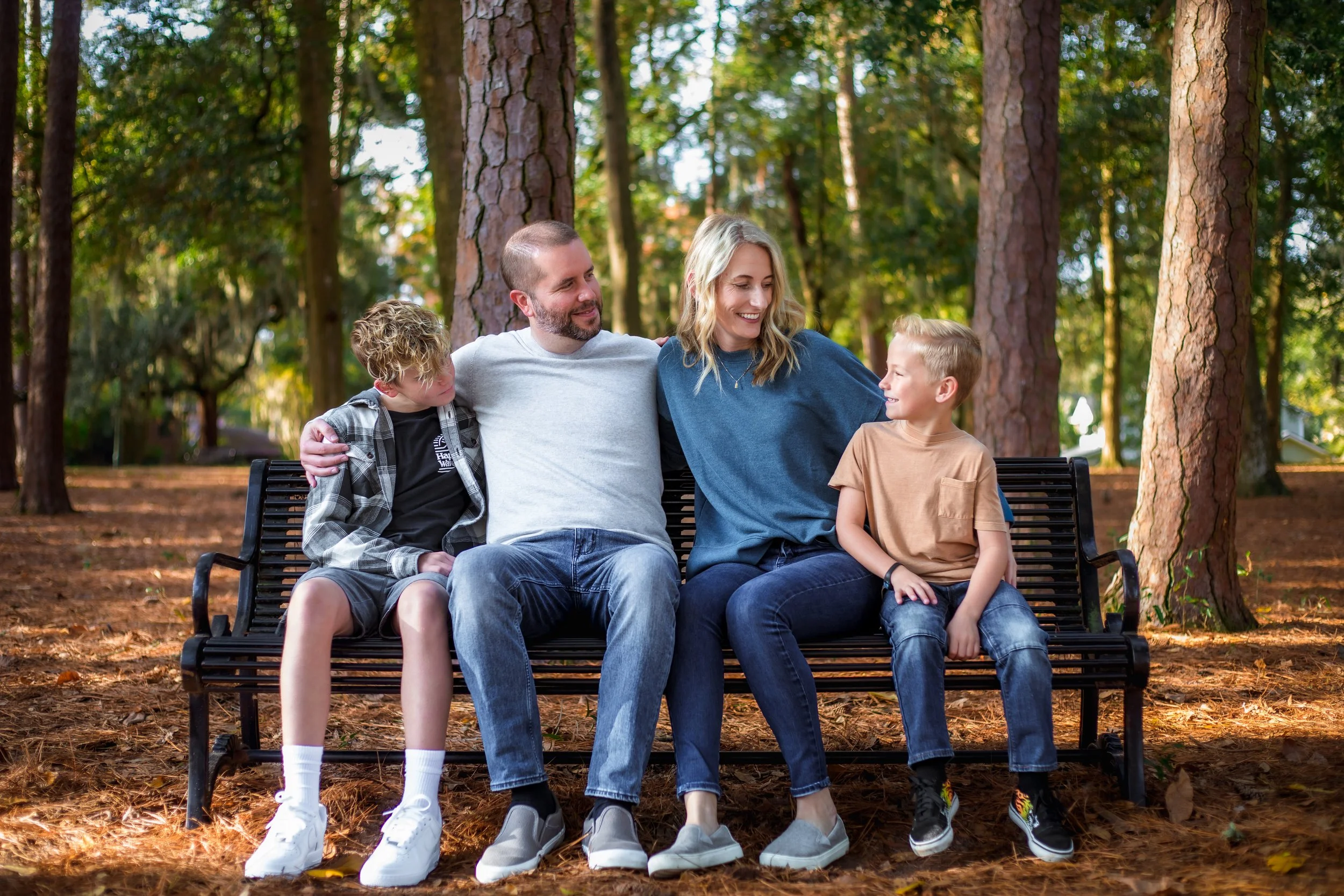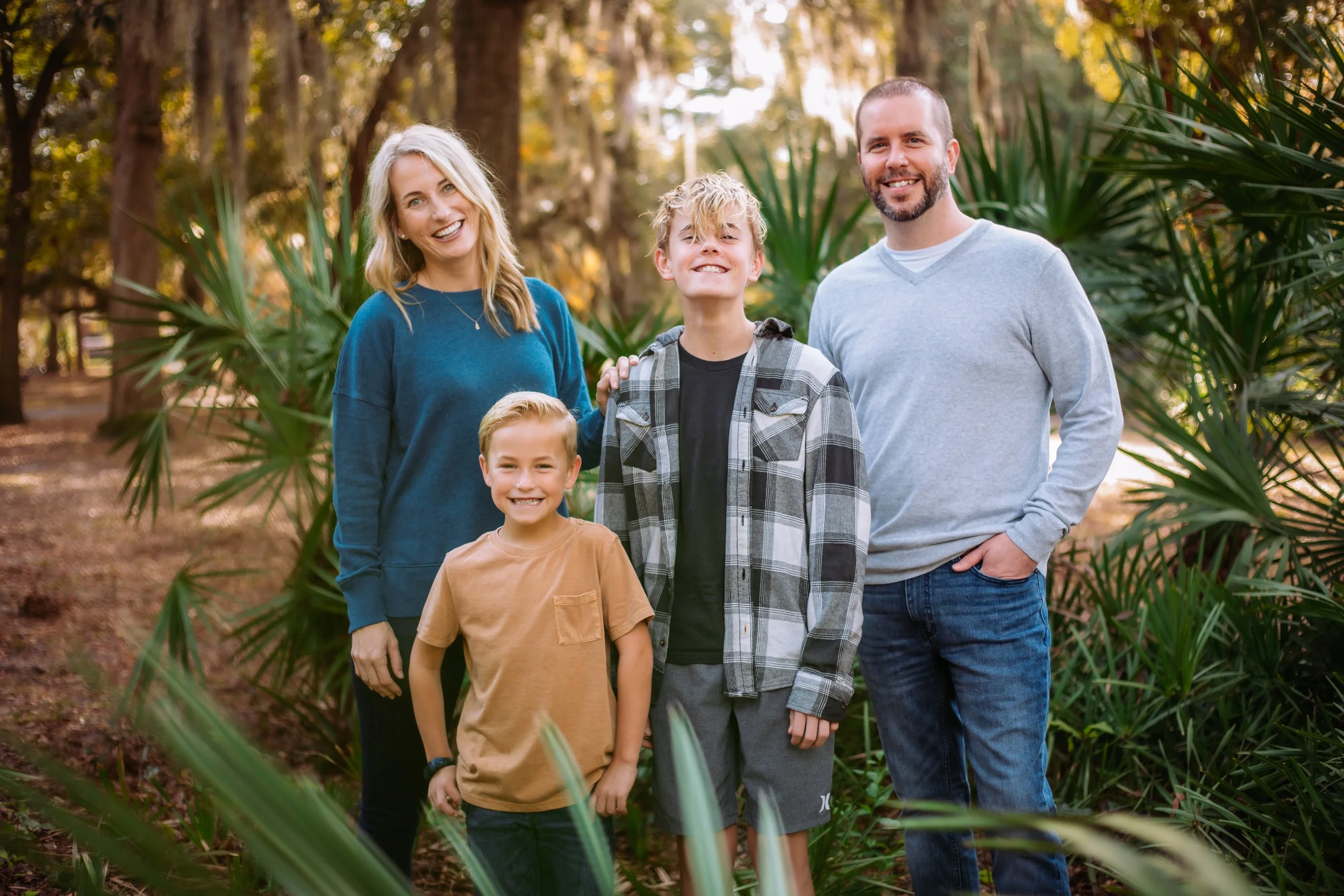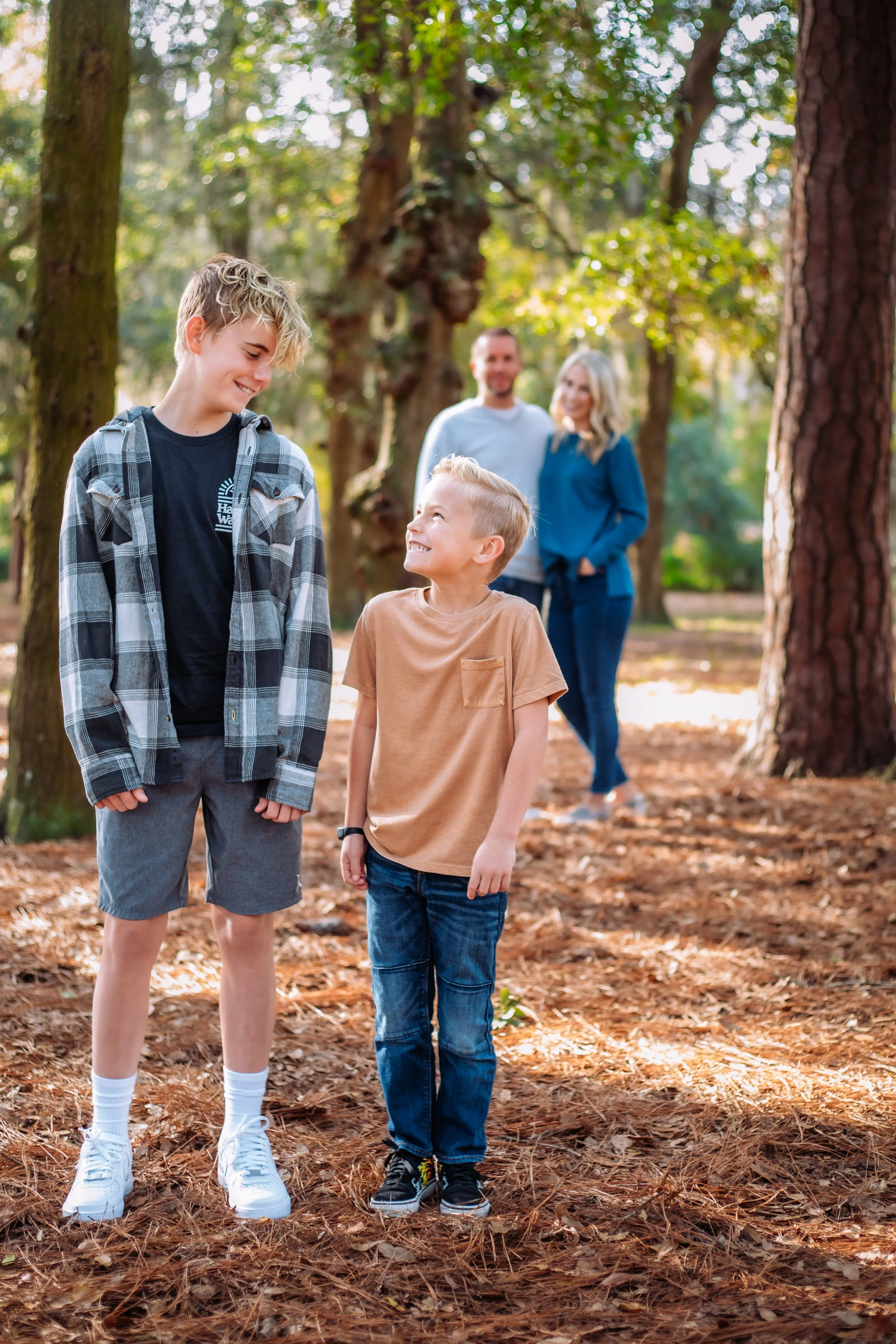 Under the golden afternoon sun, a family of four gathers among towering pine trees, the two teenage boys bursting with playful energy, their laughter echoing through the branches as warmth and joy fill the air