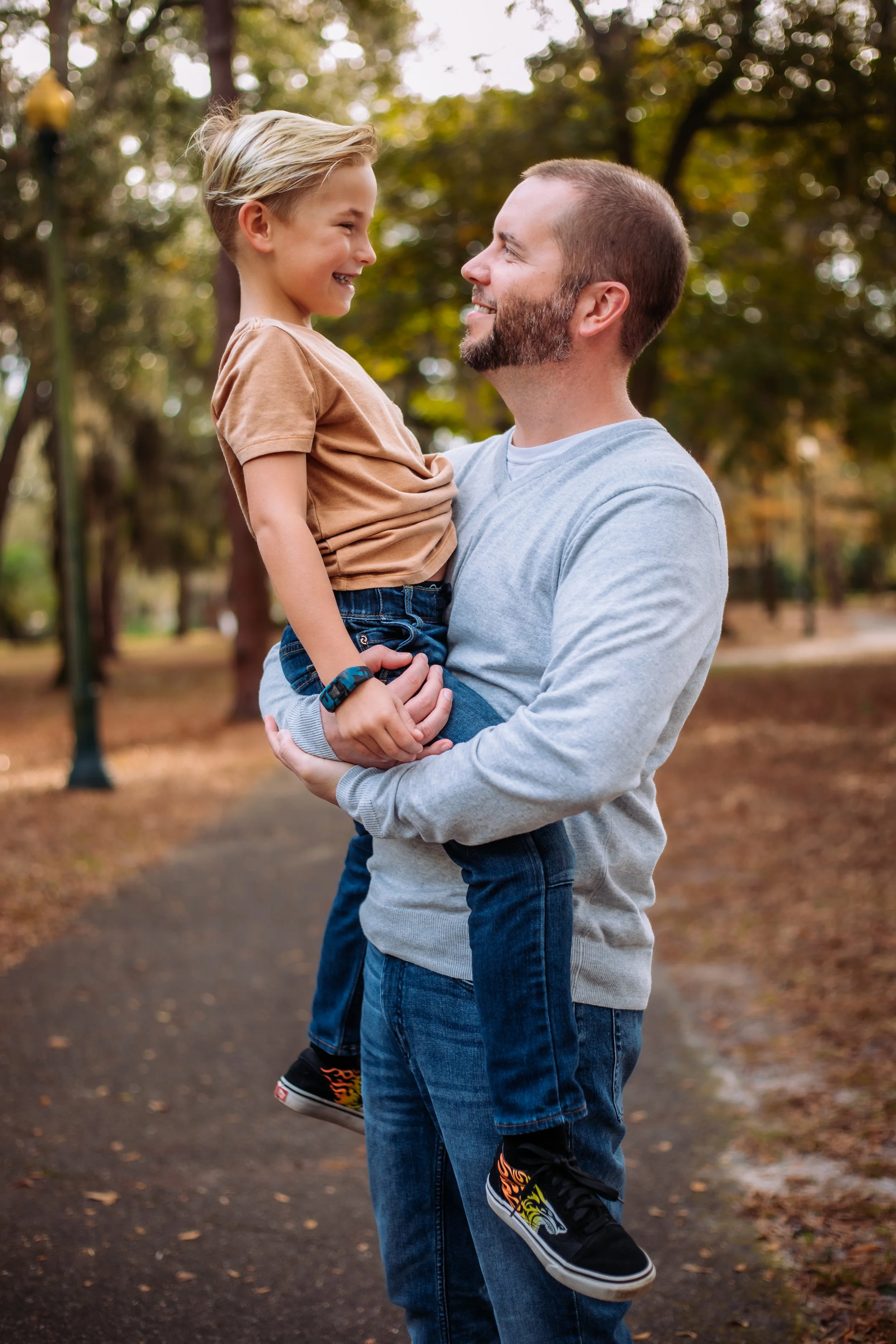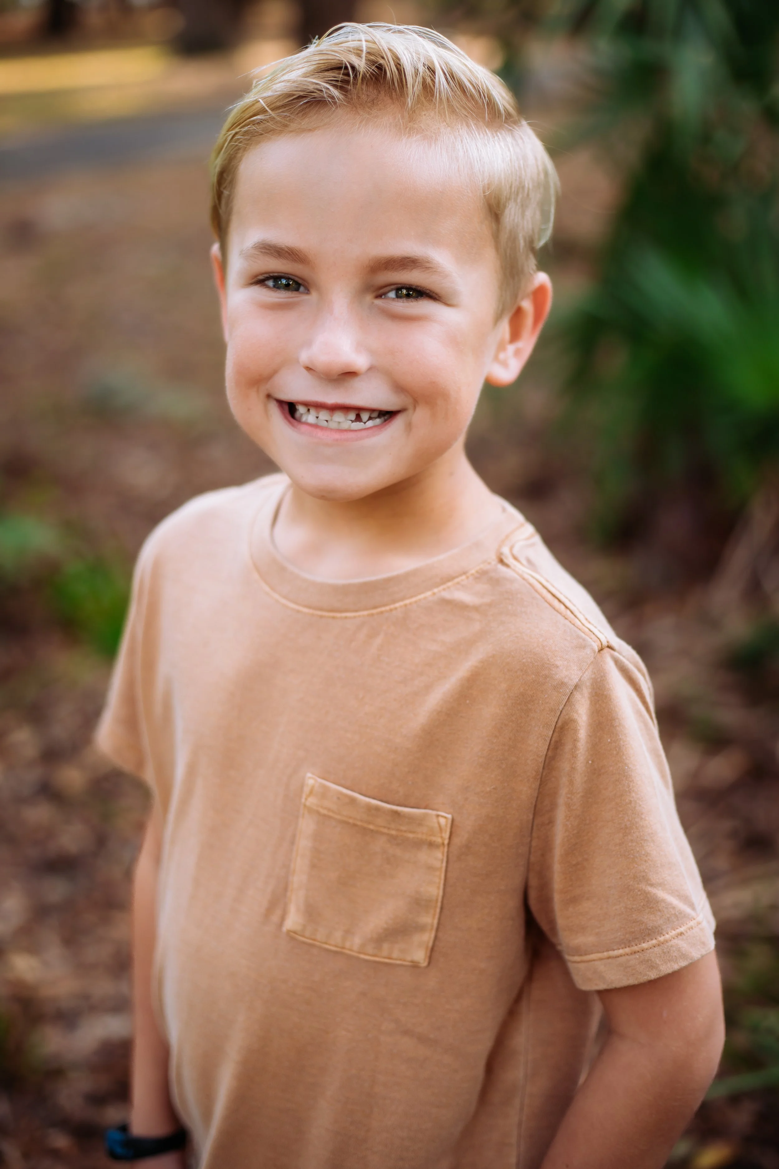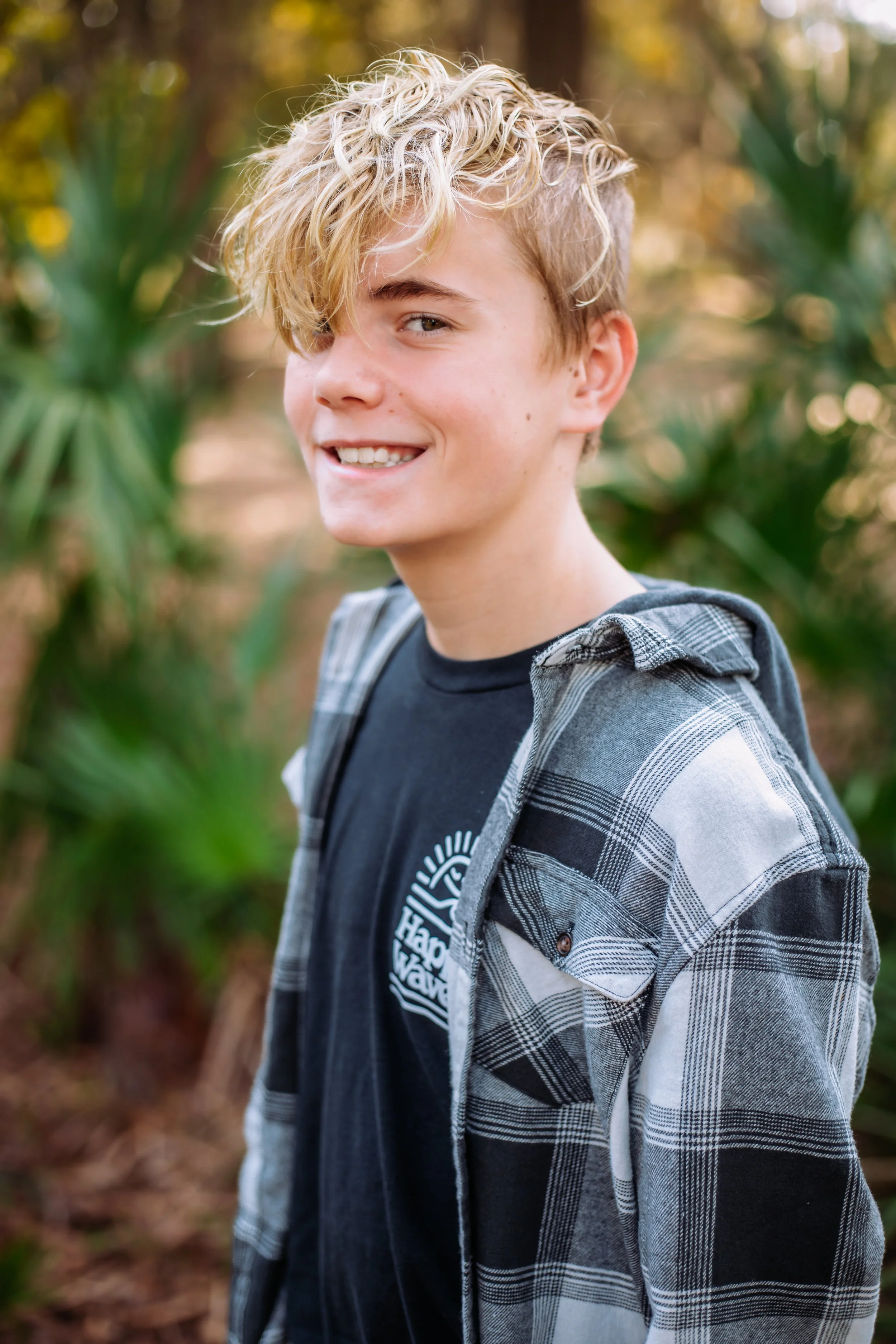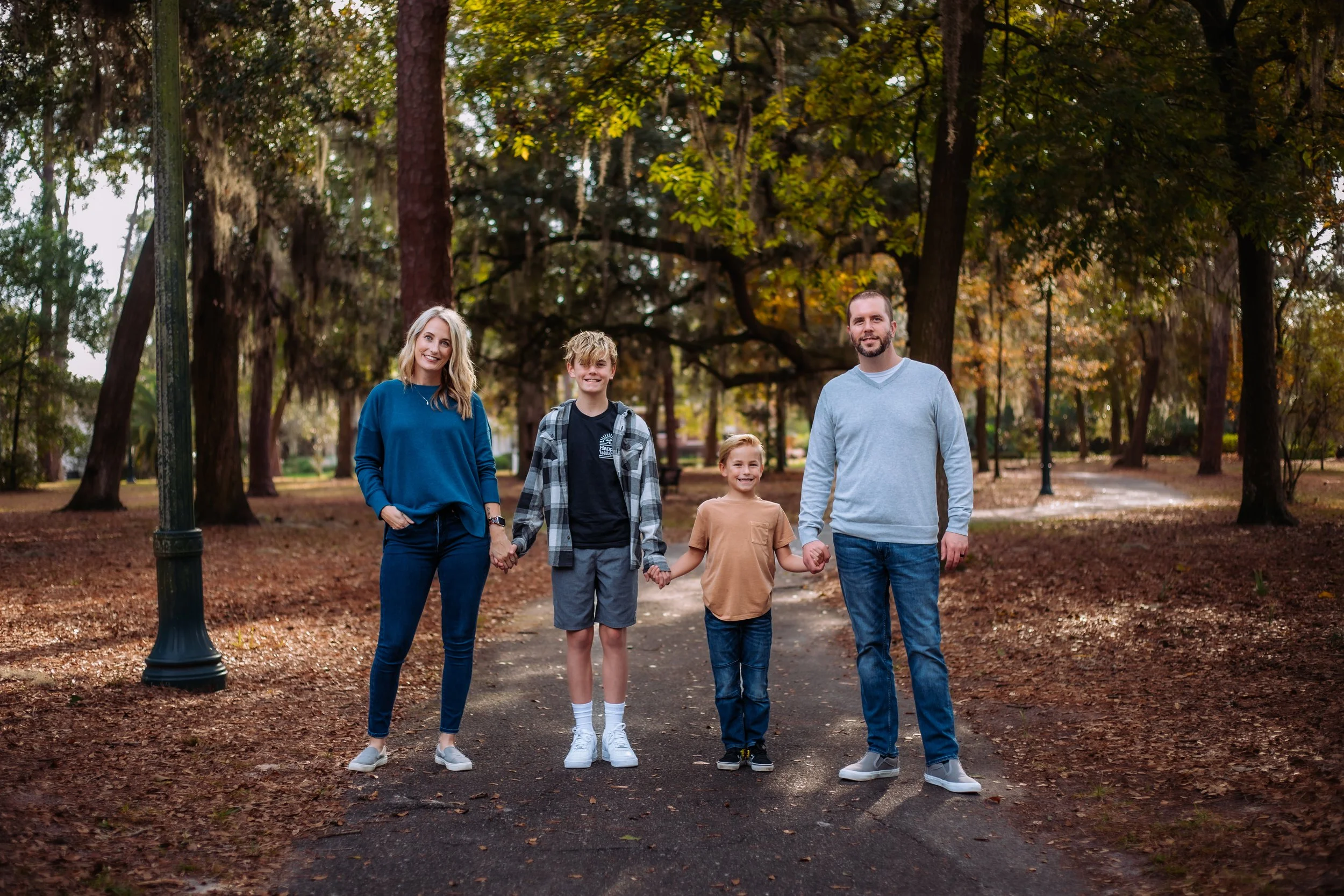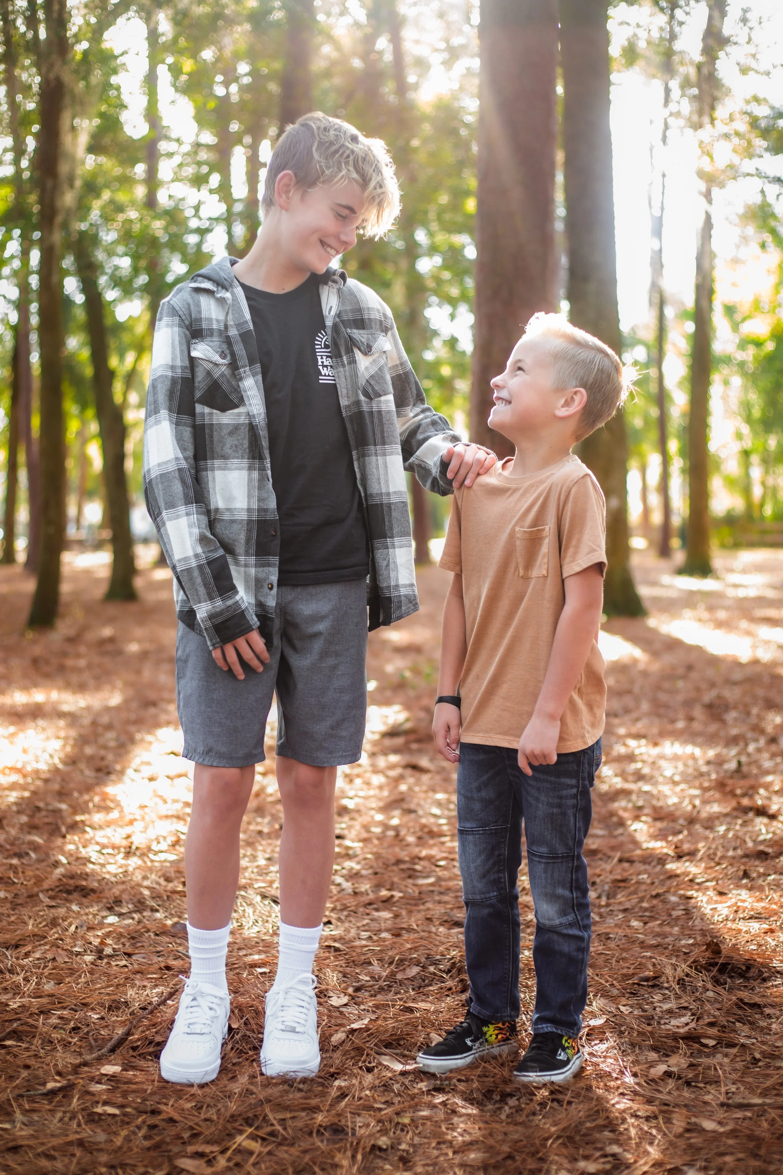 Under the golden afternoon sun, a family of four gathers among towering pine trees, the two teenage boys bursting with playful energy, their laughter echoing through the branches as warmth and joy fill the air