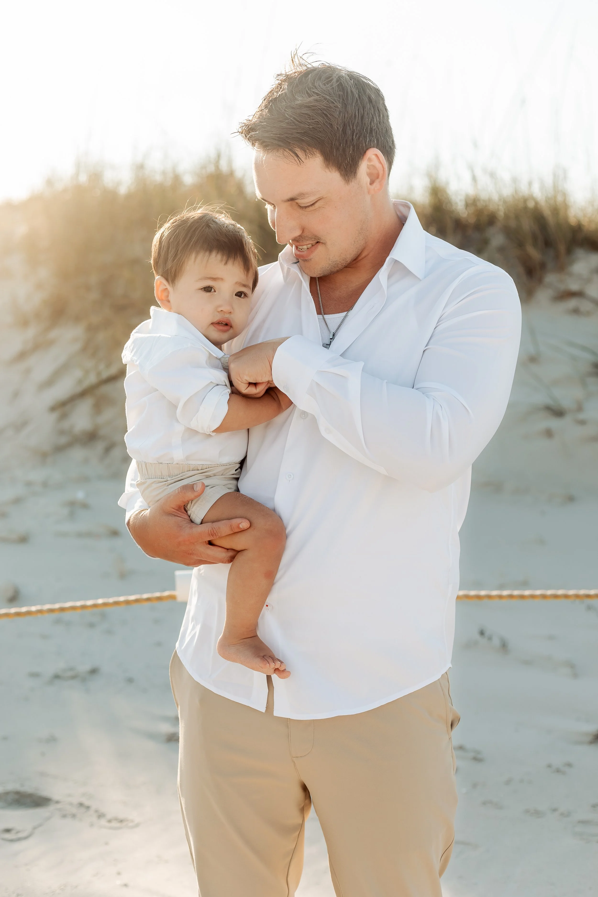 As the golden hour bathes the shoreline in warm light, a young family cherishes tender moments by the waves, the expectant mother’s gentle glow reflecting the joy of new beginnings.