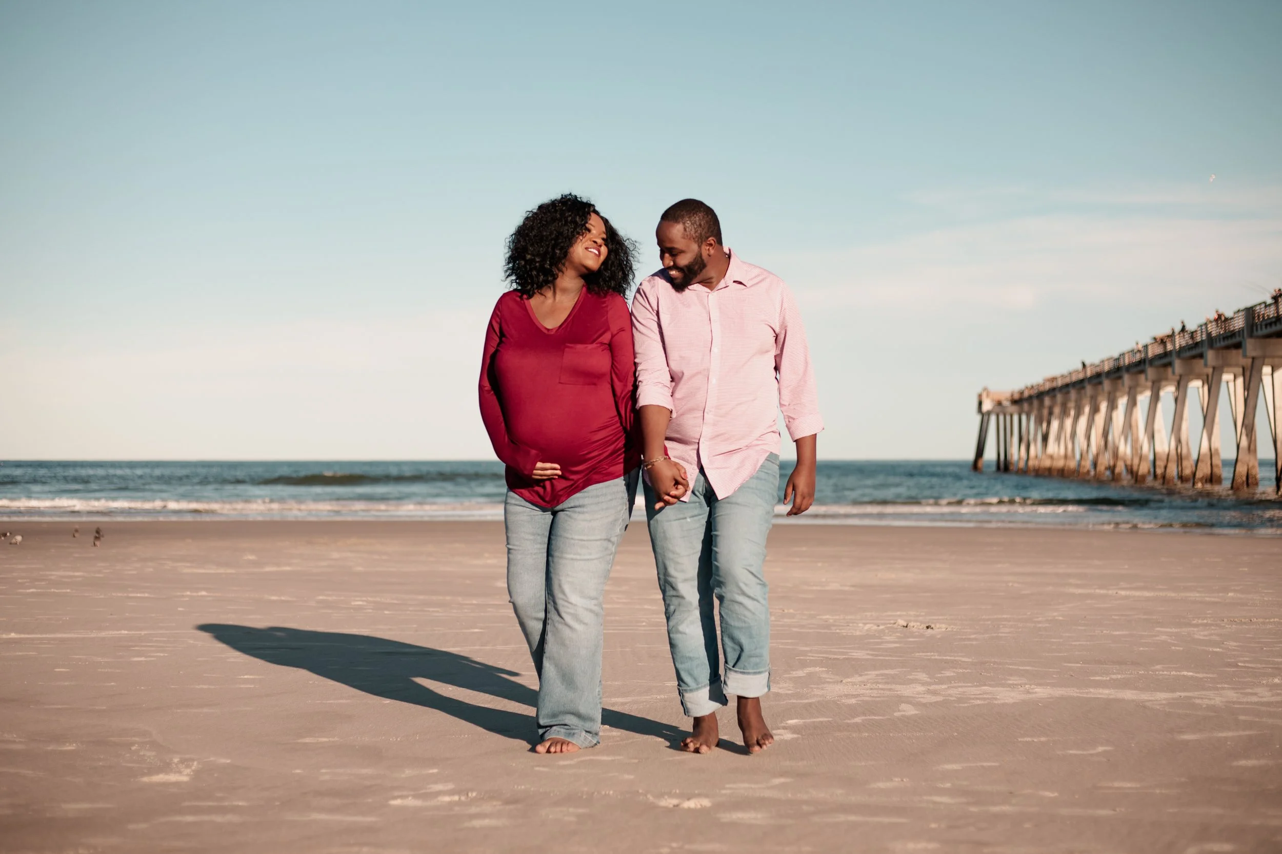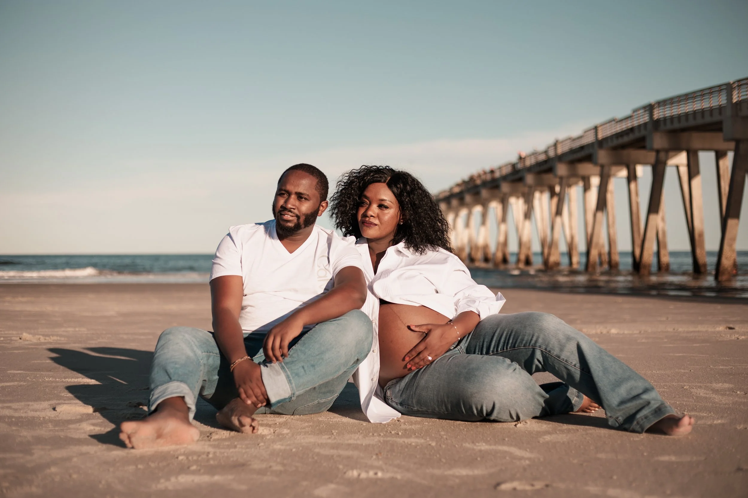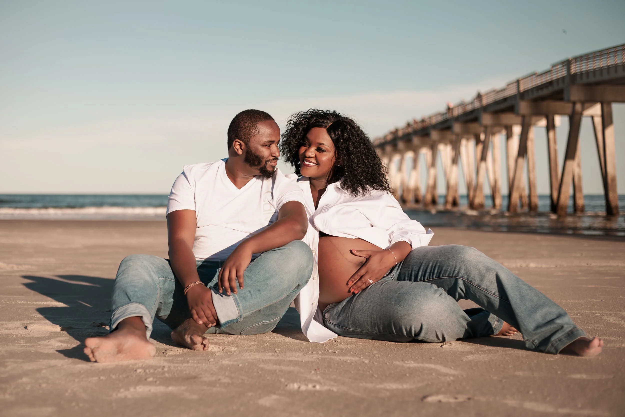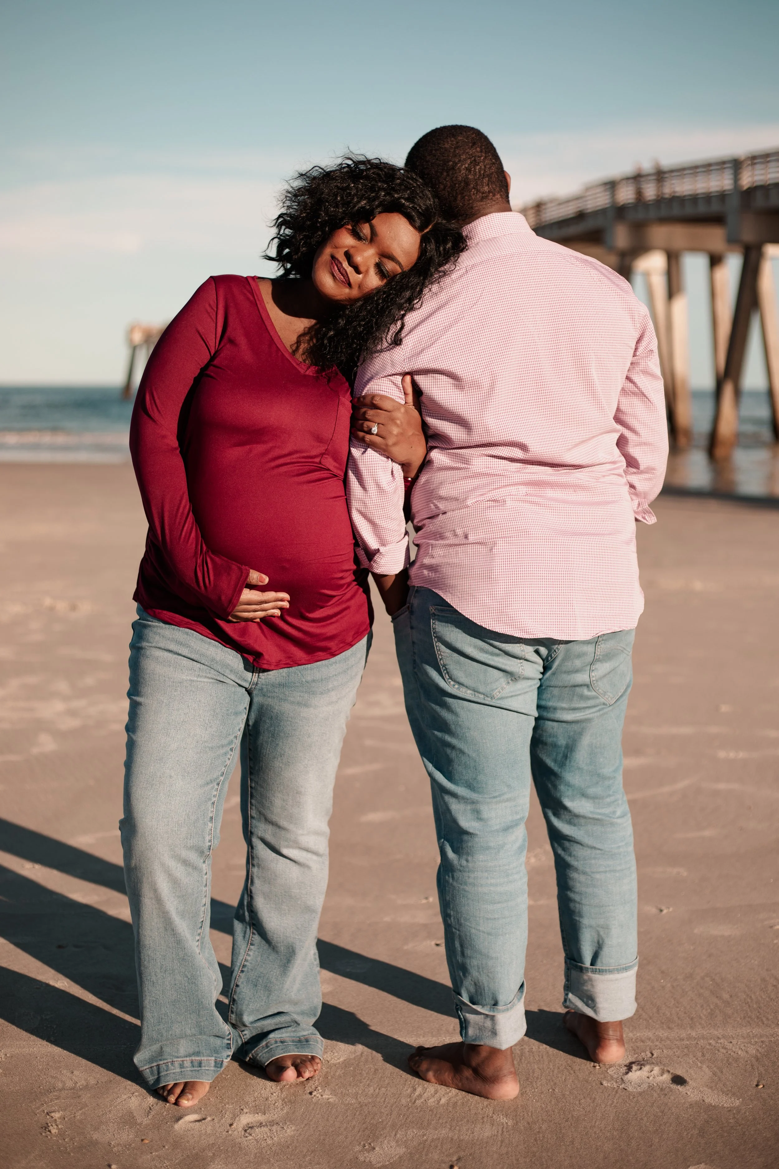As the first light of dawn kisses the ocean, a glowing mother-to-be and her partner stand together on the shore, their anticipation and love reflected in the gentle waves and soft morning breeze.