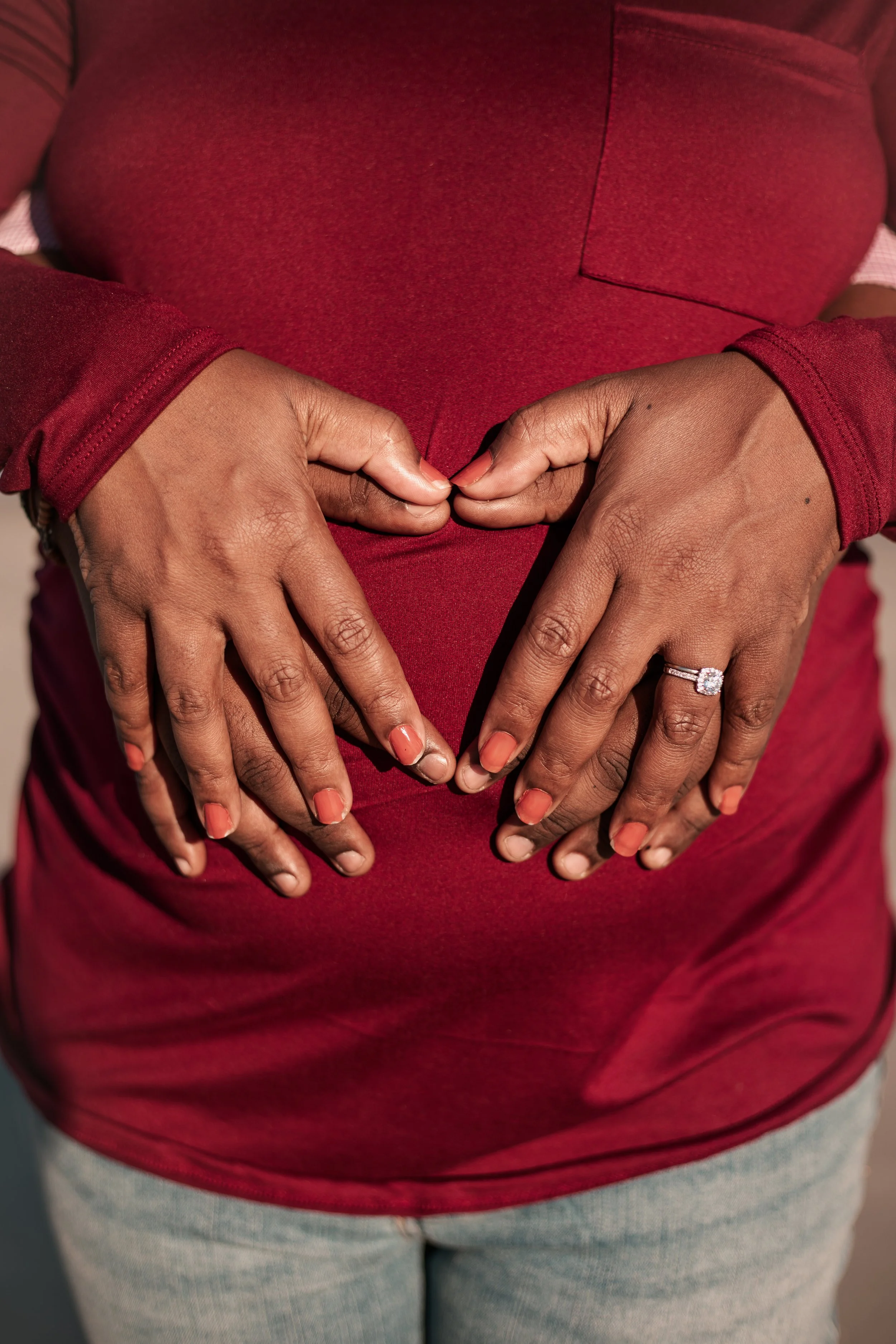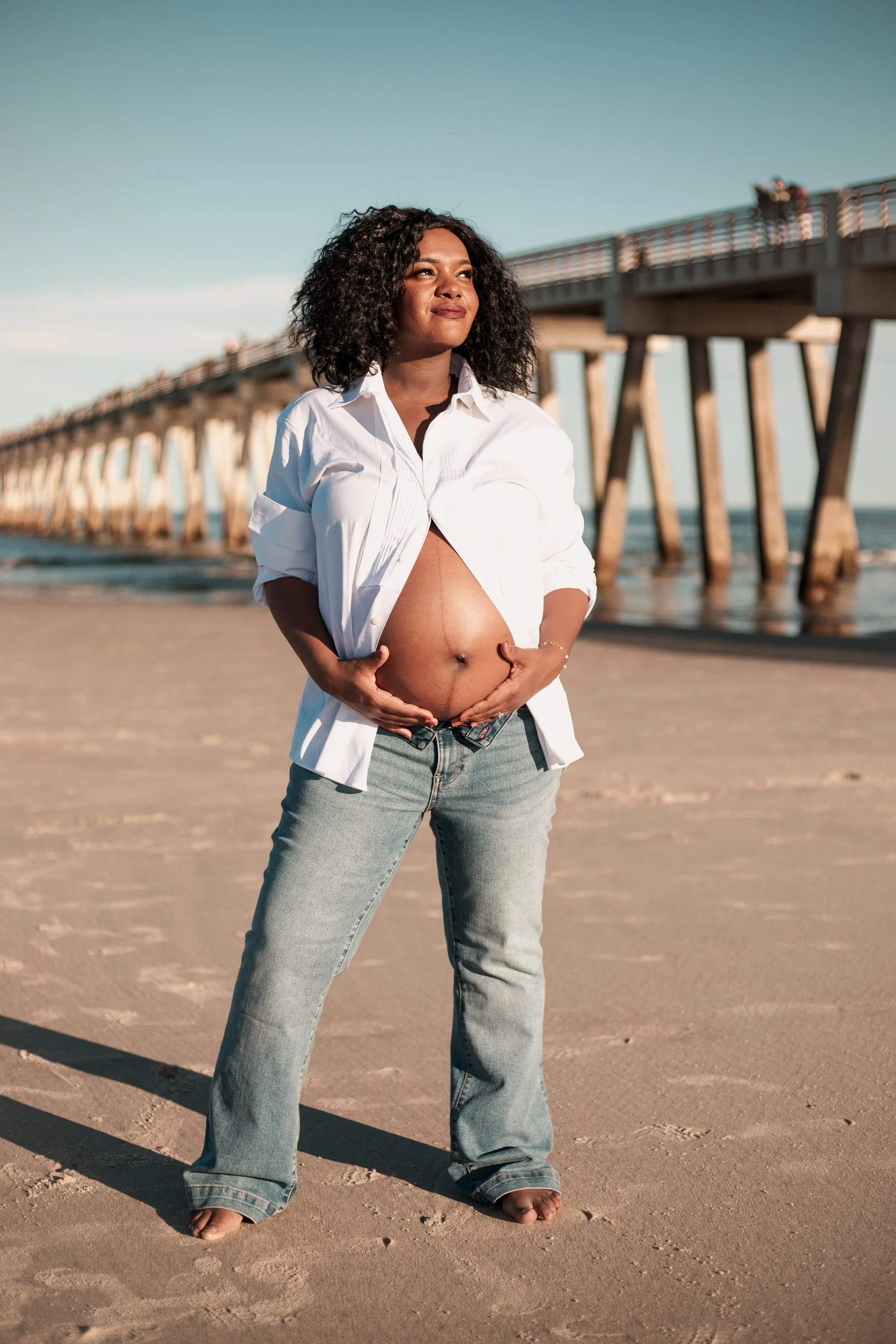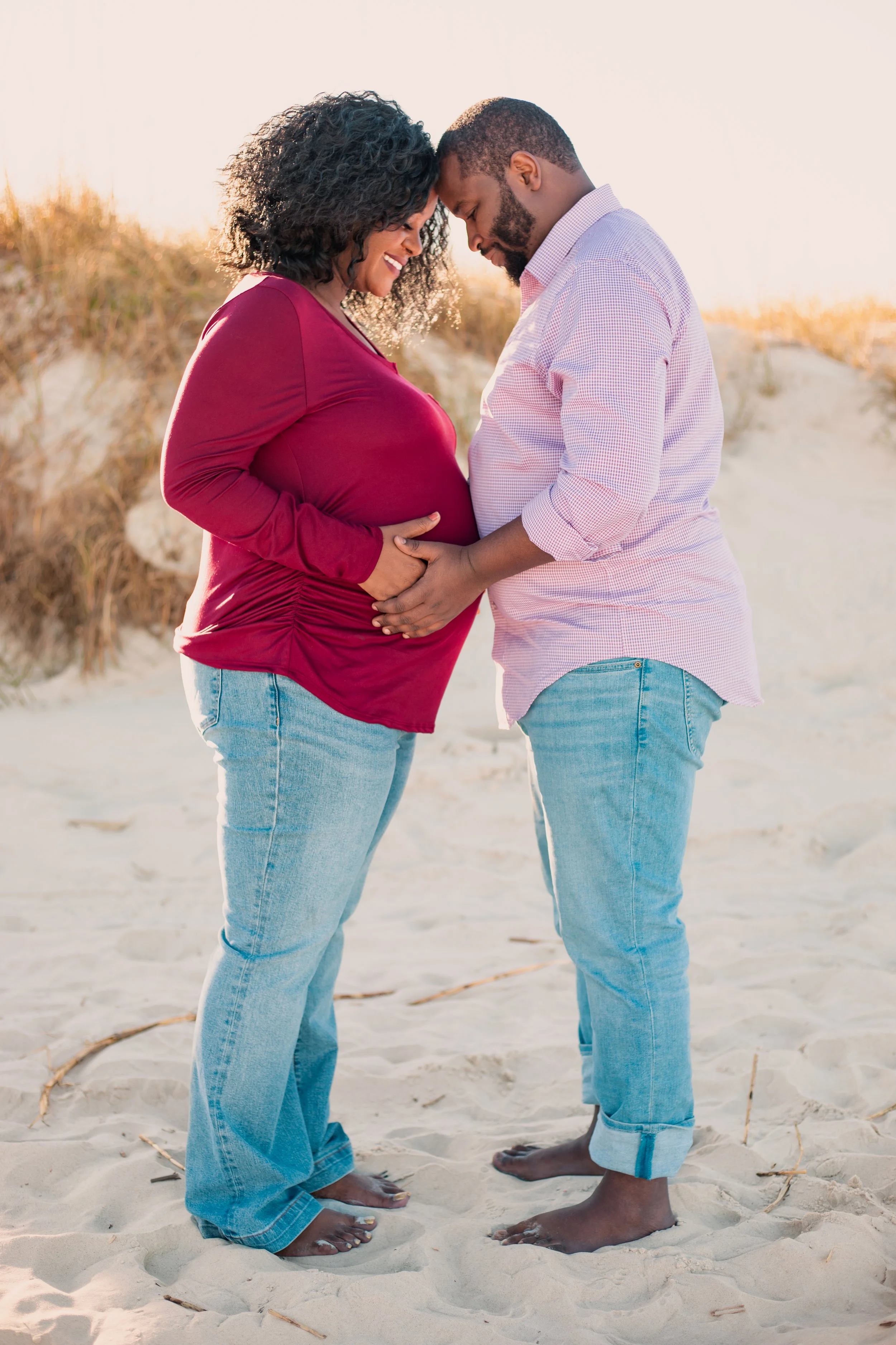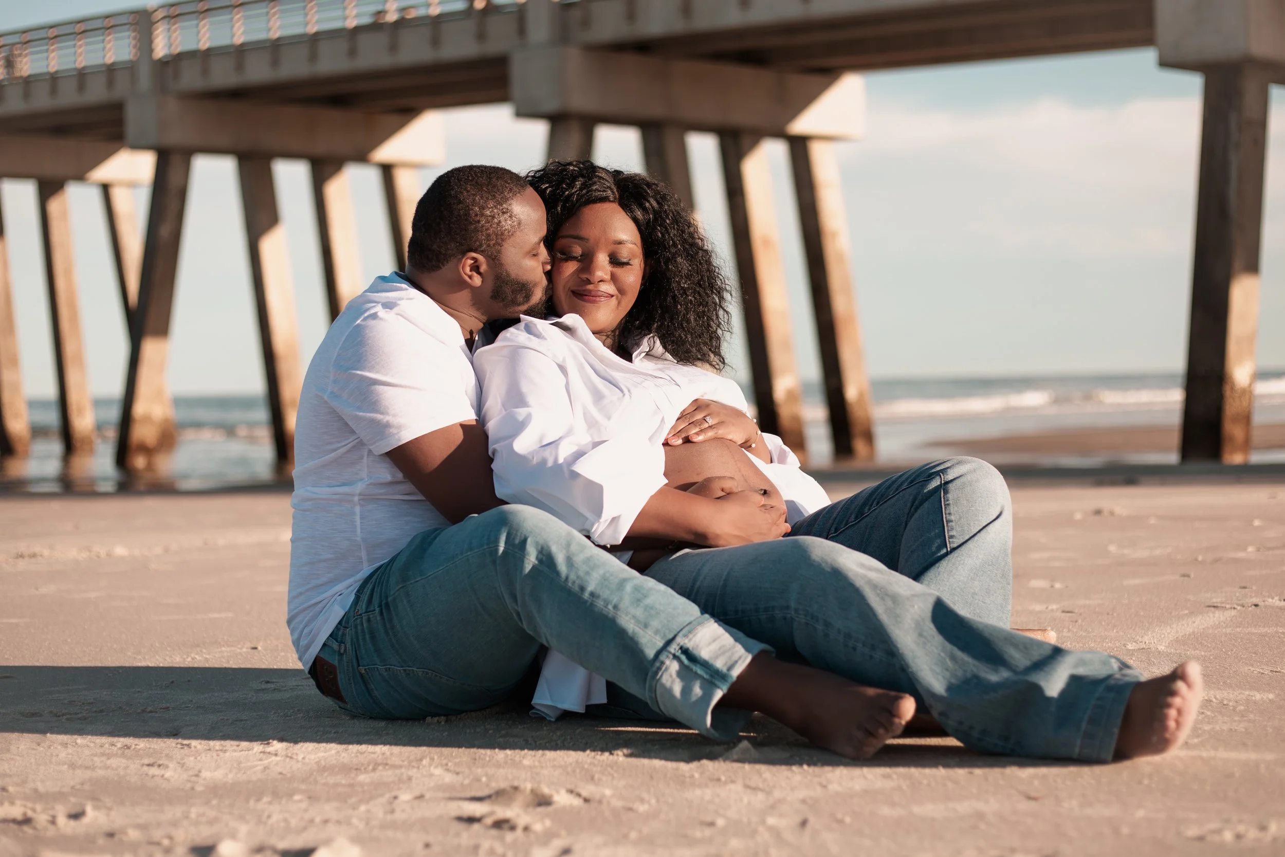 As the first light of dawn kisses the ocean, a glowing mother-to-be and her partner stand together on the shore, their anticipation and love reflected in the gentle waves and soft morning breeze.