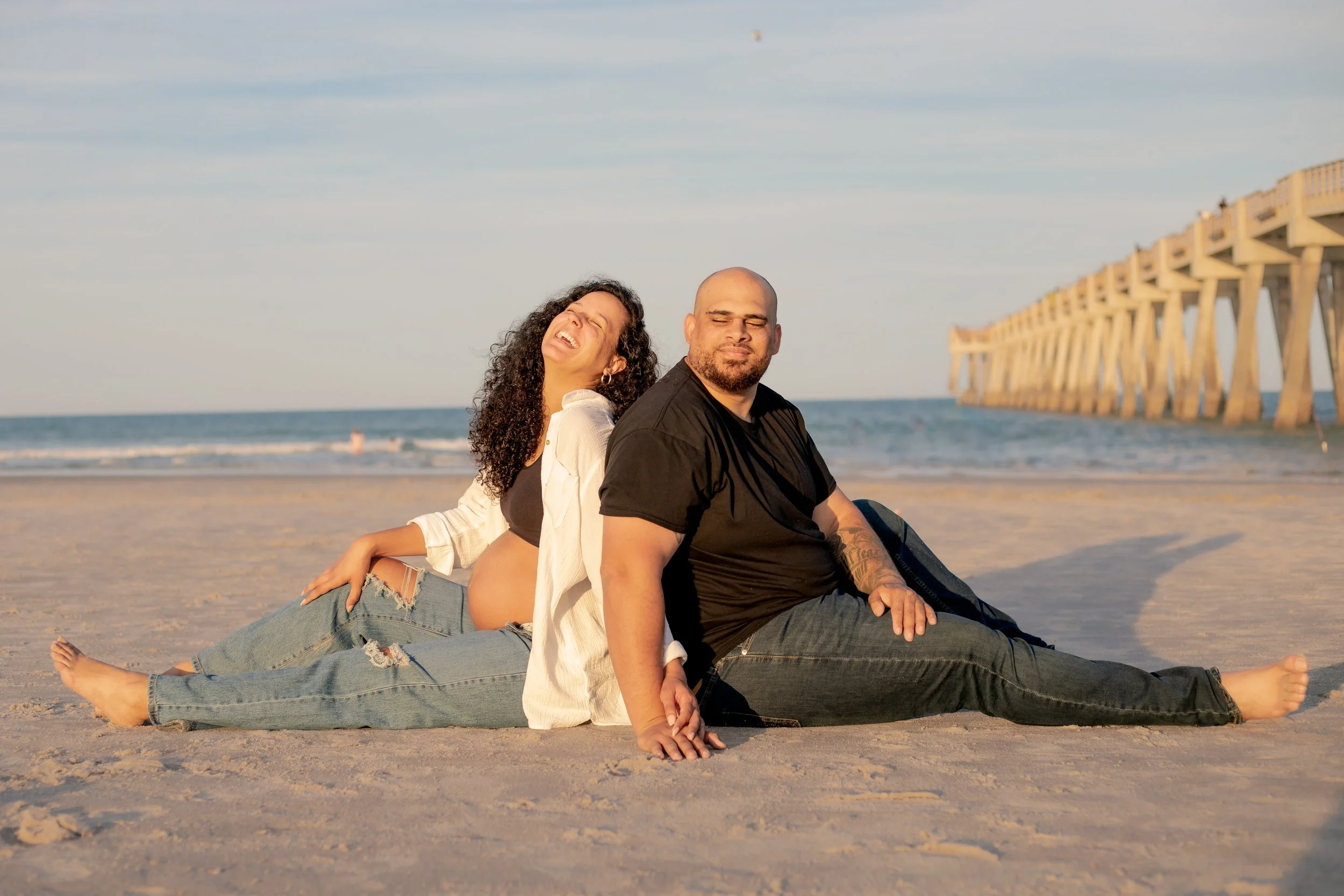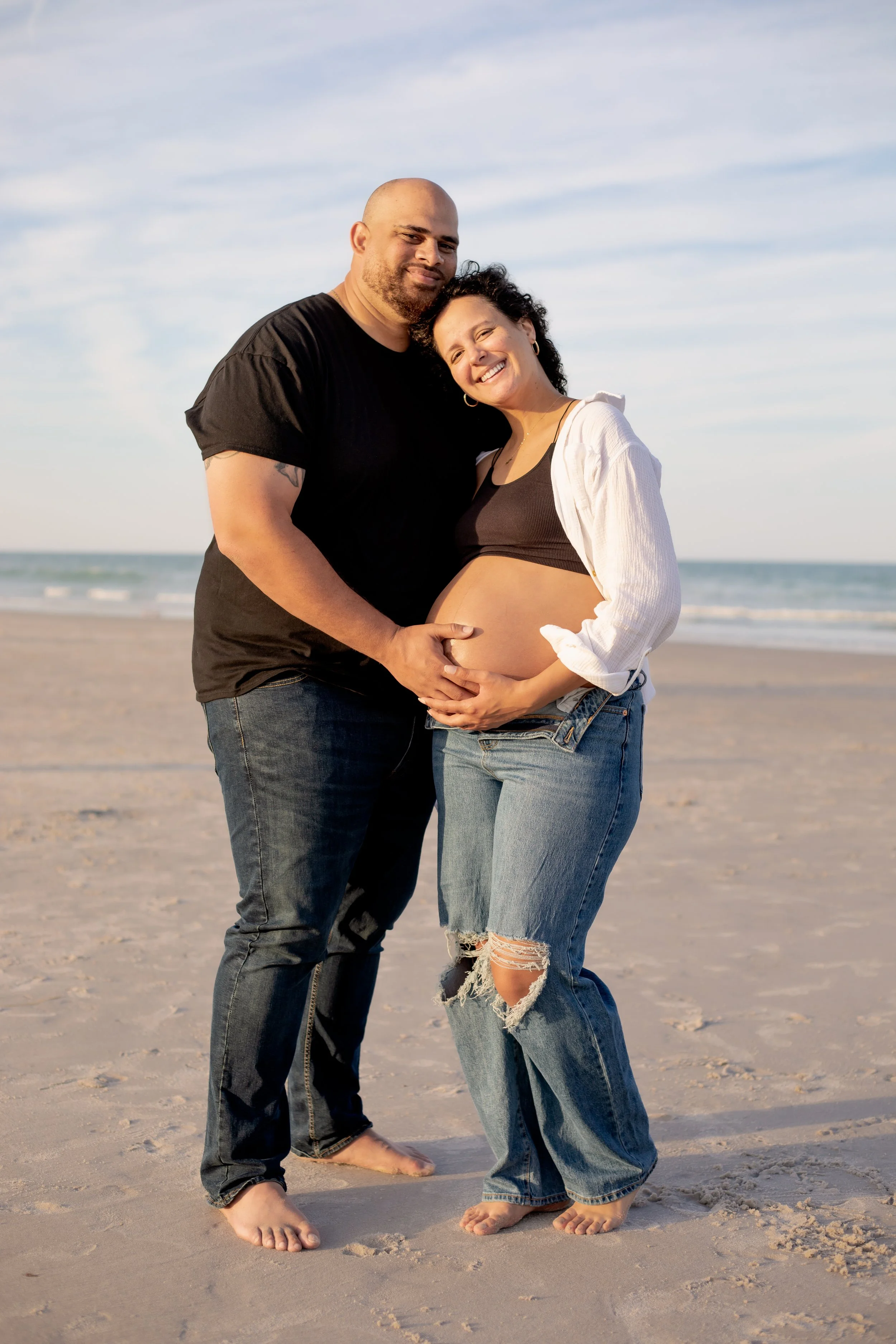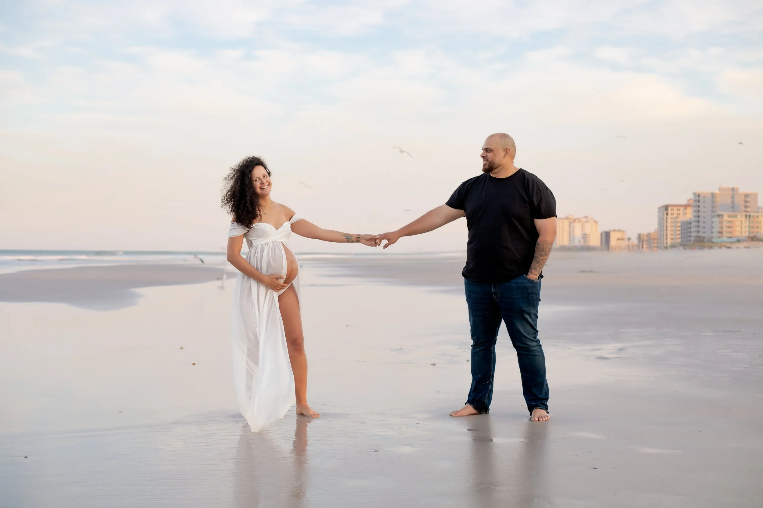 On a warm summer evening, a playful young couple fills the beach with laughter, celebrating their soon-to-arrive first child with joy, love, and lighthearted moments by the waves.