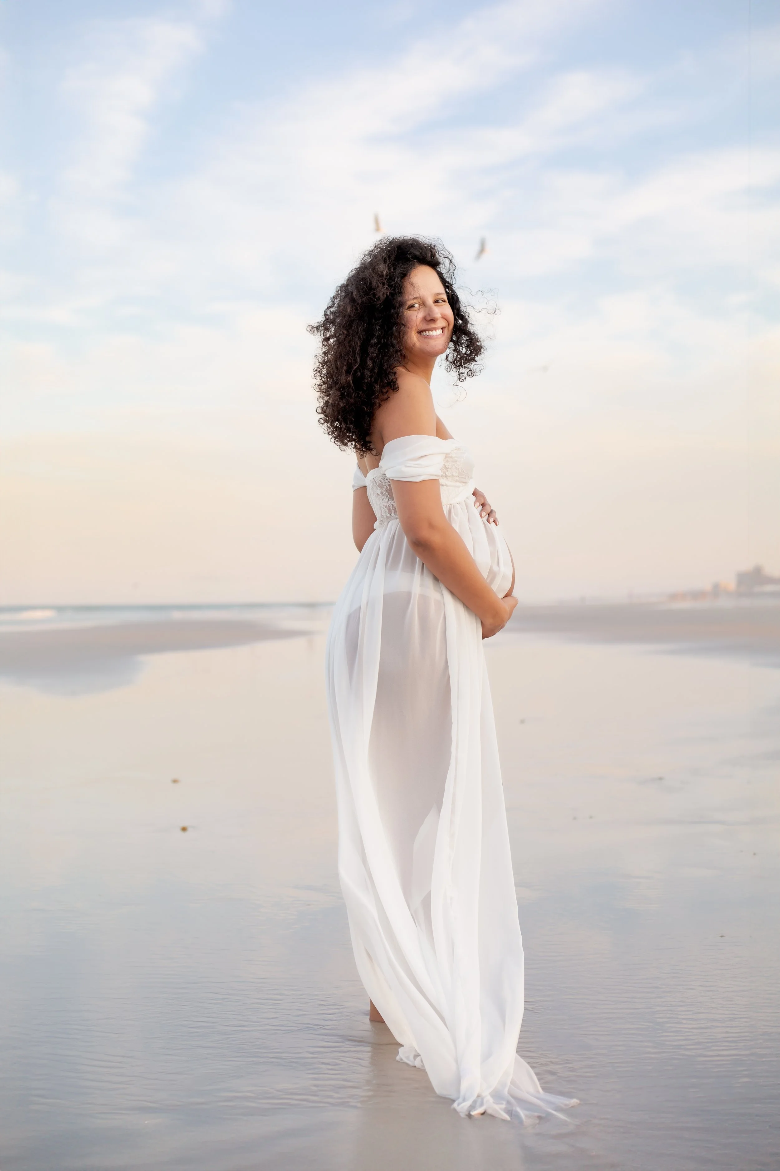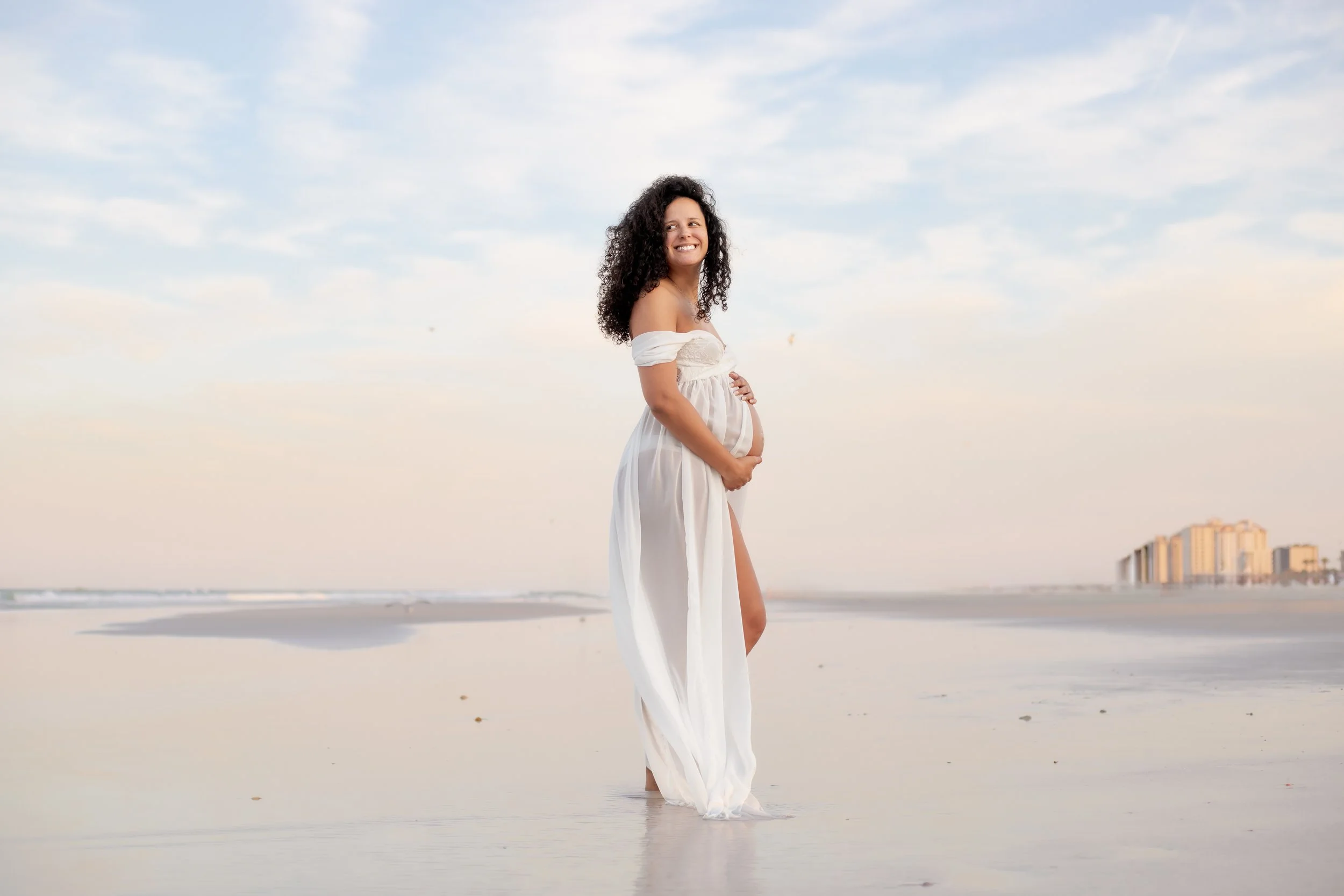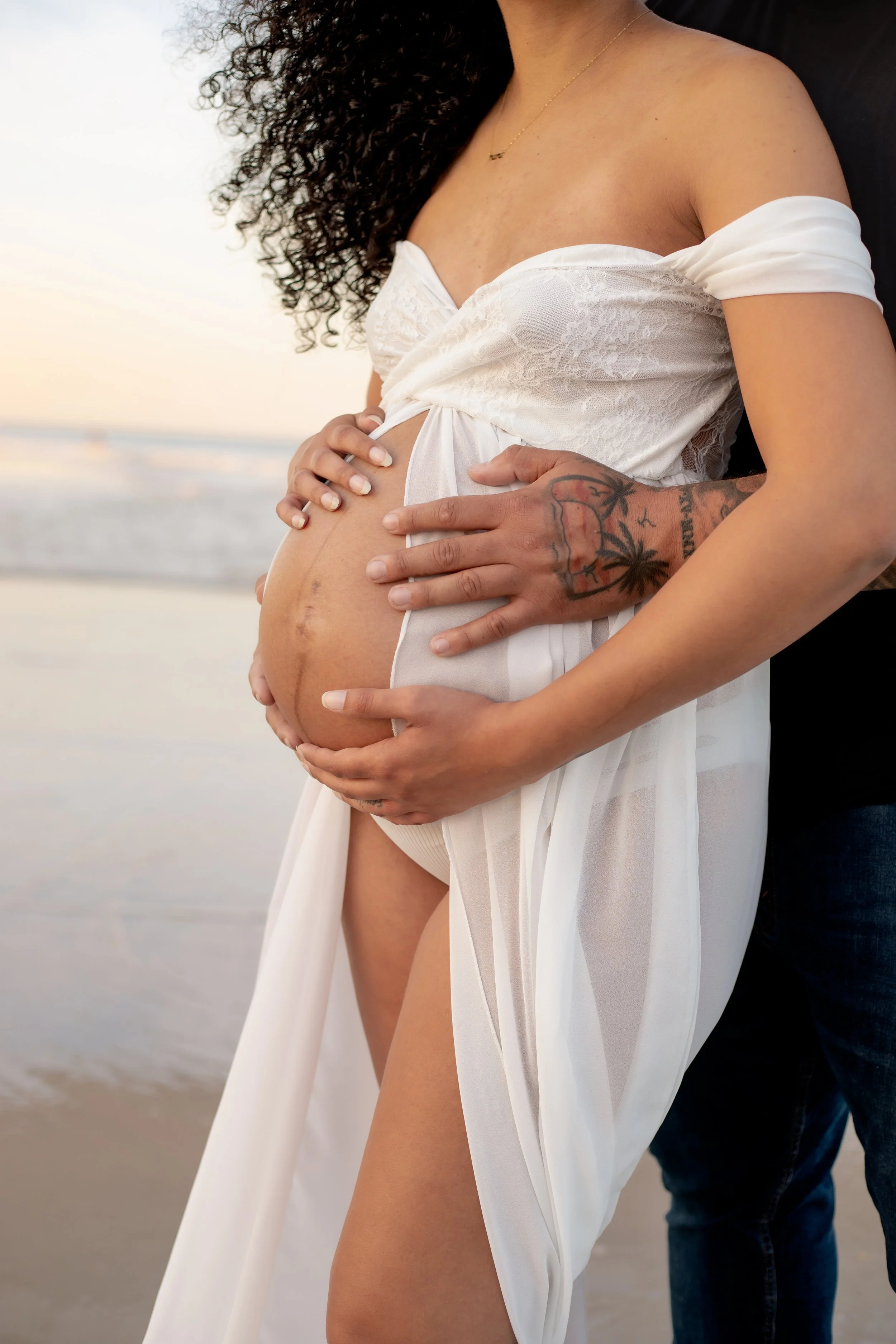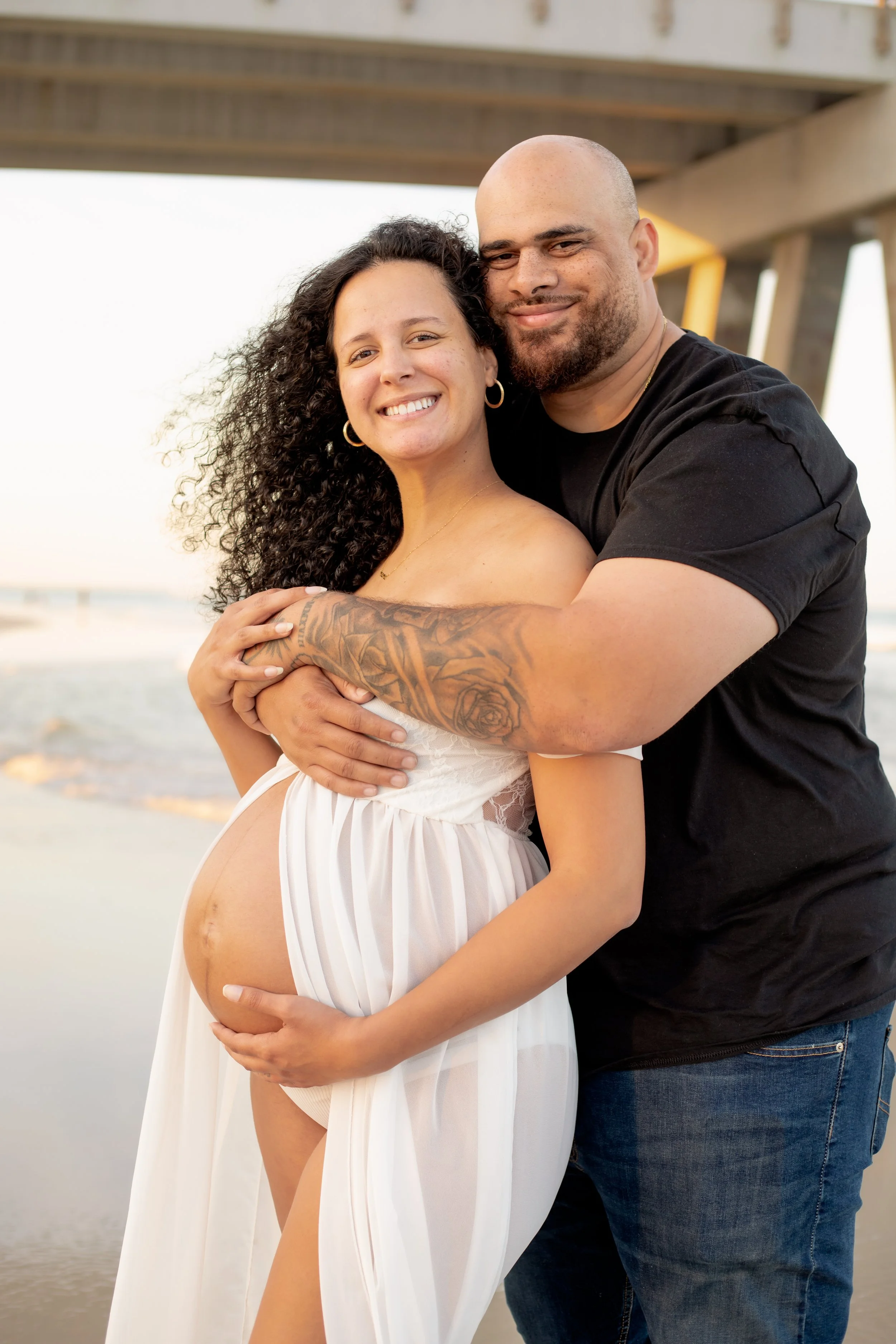 On a warm summer evening, a playful young couple fills the beach with laughter, celebrating their soon-to-arrive first child with joy, love, and lighthearted moments by the waves.